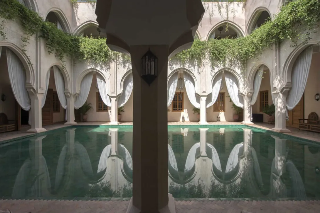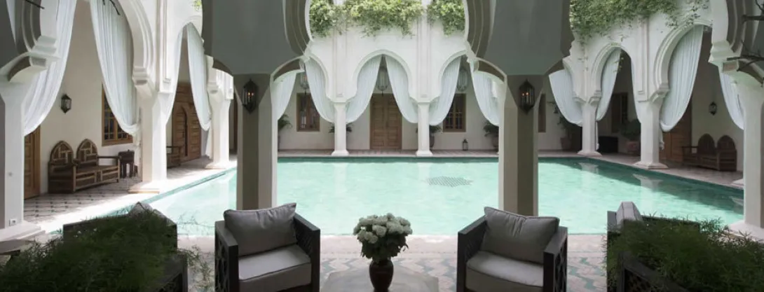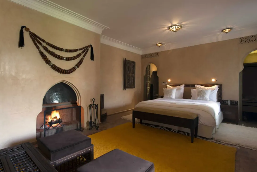 A original decoração do Almaha Marrakech foi concebida pelo arquitecto e designer belga Charles Kaisin, que se inspirou no famoso poema de Charles Baudelaire "L'invitation au voyage".Charles Kaisin combinou o design tradicional marroquino, incluindo séculos de artesanato tradicional, com elementos de design contemporâneo.Com 13 quartos e suites decorados individualmente, é um refúgio tranquilo localizado na Kasbah - um dos bairros nobres da medina de Marrakech -, onde, em tempos, os antigos estábulos reais se encontravam.Não há nenhum lugar na terra como Jemaa el Fna, a praça mais famosa no coração da autêntica Marrakech. E não há nenhum lugar como o salão Pixel, do Almaha Marrakech, que celebra essa mistura inebriante de descobertas desta praça única. Imagens de Jemaa el Fna transformadas em seda são utilizadas forrando toda a parede desta sala de estar (23.000peças). é perfeito para se deliciar com uma taça de champanhe - de Taittinger Brut ou Billecart-Salmon Brut - e bolos.A Biblioteca do Almaha Marrakech - com a variedade e diversidade dos seus 1083 livros celebrando a literatura francesa - é totalmente influenciada pelo poema onde Baudelaire escreve sobre o luxo, a paz e o prazer. Para Charles, "o conteúdo do poema é um ponto de partida para a compreensão do design interior do Almaha. é um convite para abrir a mente e descobrir outras culturas." Um lugar perfeito para jantar em noites de inverno com a lareira acessa.Em cada livro uma página está dobrada por forma a mostrar uma letra do alfabeto. E, com todas juntas, os hóspedes podem então descobrir e ler o poema.Pequeno o suficiente para oferecer aos hóspedes uma experiência individualizada, o Almaha Marrakech é um luxuoso riad, independente, e que oferece excelentes instalações.O quarto Pixel é e a Biblioteca é óptima para os pequenos almoços, almoço e jantar.Com uma área total de 4.000 m², o Riad Almaha dispõe ainda de um fantástico terraço, de um spa com 2 salas de massagem, 2 hammams, um jacuzzi e uma piscina num terraço no primeiro andar.
