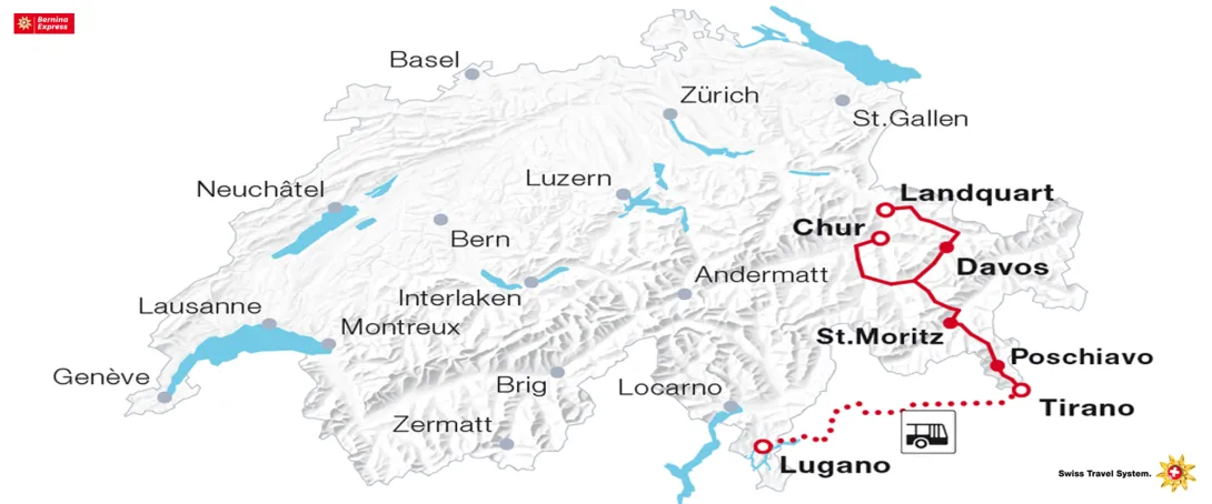 No Verão, a viagem pode ser extensível a Tirano e a Lugano (Itália) a bordo do autocarro da mesma organização - Bernina Express - sempre com a qualidade e serviço de excelência do Swiss Travel System.