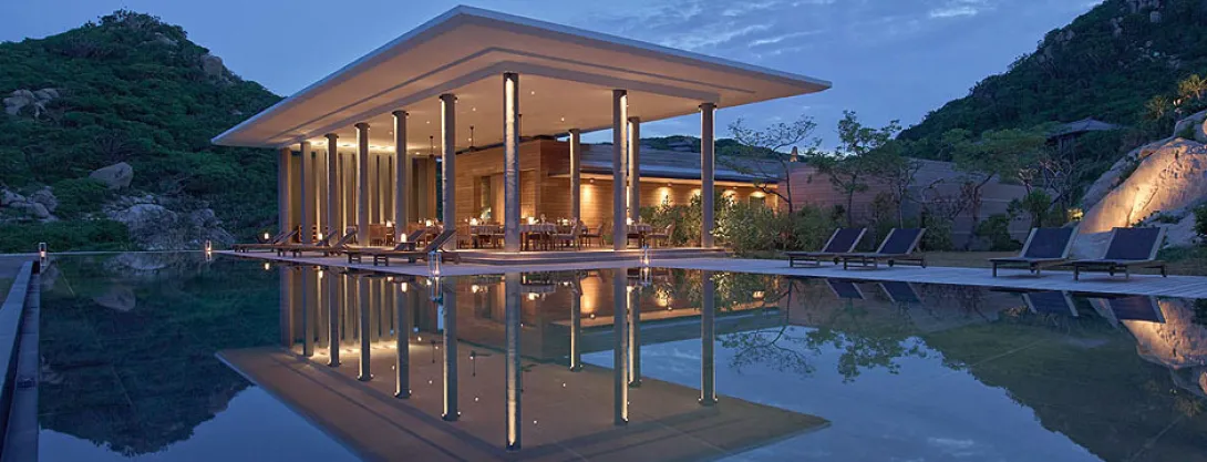 O espectacular litoral de Ninh Thuan é o cenário para este novo membro do portfólio Amanresorts: Amanoi...Derivado do sânscrito para "paz" e "noi", que significa lugar, descansa num imenso promontório do Parque Nacional Nui Chua com vista para as areias brancas da praia e as belas águas da baía de Vinh Hy.Os 55 km de carro desde o aeroporto de Cam Ranh terminam numa viagem cénica através do Parque Nacional, que conduz os hóspedes até ao Amanoi. Escadas amplas levam ao Pavilhão Central, que oferece uma vista de tirar o fôlego sobre o panorama, abaixo, fazendo com que a chegada seja realmente uma experiência inesquecível.Situado no topo da colina, o Pavilhão Central abriga o restaurante onde a cozinha é uma combinação de deliciosos pratos vietnamitas e ocidentais, preparados apenas com os mais frescos ingredientes locais. Também ali ficam o Bar, com um terraço com vista espectacular, The Library, lugar para relaxar com um livro, e a The Boutique, que vende artigos tradicionais vietnamitas em laca e outros objectos artesanais.Com duas belas piscinas, Amanoi é o resort perfeito para relaxar: uma, Cliff Pool, fica perto do Pavilhão Central, enquanto a outra está instalada no Beach Club com vista para a praia. Uma variedade de desportos aquáticos estão disponíveis como hobie cats e caiaques, perfeitos para explorar as grutas e enseadas ao redor da baía. Mas, para além das inúmeras actividades desportivas e no exterior do resort, o Amanoi não deixa os seus merecidos créditos em mãos alheias. Quem prefere não se "aventurar", econtrará muita coisa para se ocupar no Amanoi: um espaçoso Gymnsasium, dois courts de ténis ao ar livre, um Pilates Studio e um pavilhão de yoga à beira do lago. Ainda, claro, um Spa, o Spa at Amanoi: instalado num ambiente sereno, encostado a um lago de lótus, os tratamentos utilizam produtos livres de químicos, juntamente com ingredientes tradicionais vietnamitas. é um lugar tranquilo feito para o relaxamento e o rejuvenescimento.Cada um dos 31 pavilhões é uma combinação de estilo tradicional vietnamita e elegância contemporânea. Na encosta, todos são idênticos no layout, com áreas espaçosas, luxuosas casas de banho e um terraço completo com espreguiçadeiras. Os Pavilhões têm vista para a paisagem circundante, com alguns oferecendo o luxo adicional de uma piscina privada.Os Ocean Pavilions, também com piscinas privadas, têm vistas deslumbrantes sobre a baía de Vinh Hy. As cinco Villas, por seu lado, são perfeitas para os hóspedes que desejam maior privacidade, para famílias ou para amigos que viajam juntos. Cada uma tem uma grande piscina, sala de estar e de jantar e quatro ou cinco quartos independentes. Há também uma cozinha privada para a preparação de refeições. Uma governanta e um cozinheiro garantem qualquer "capricho" dos hóspedes.