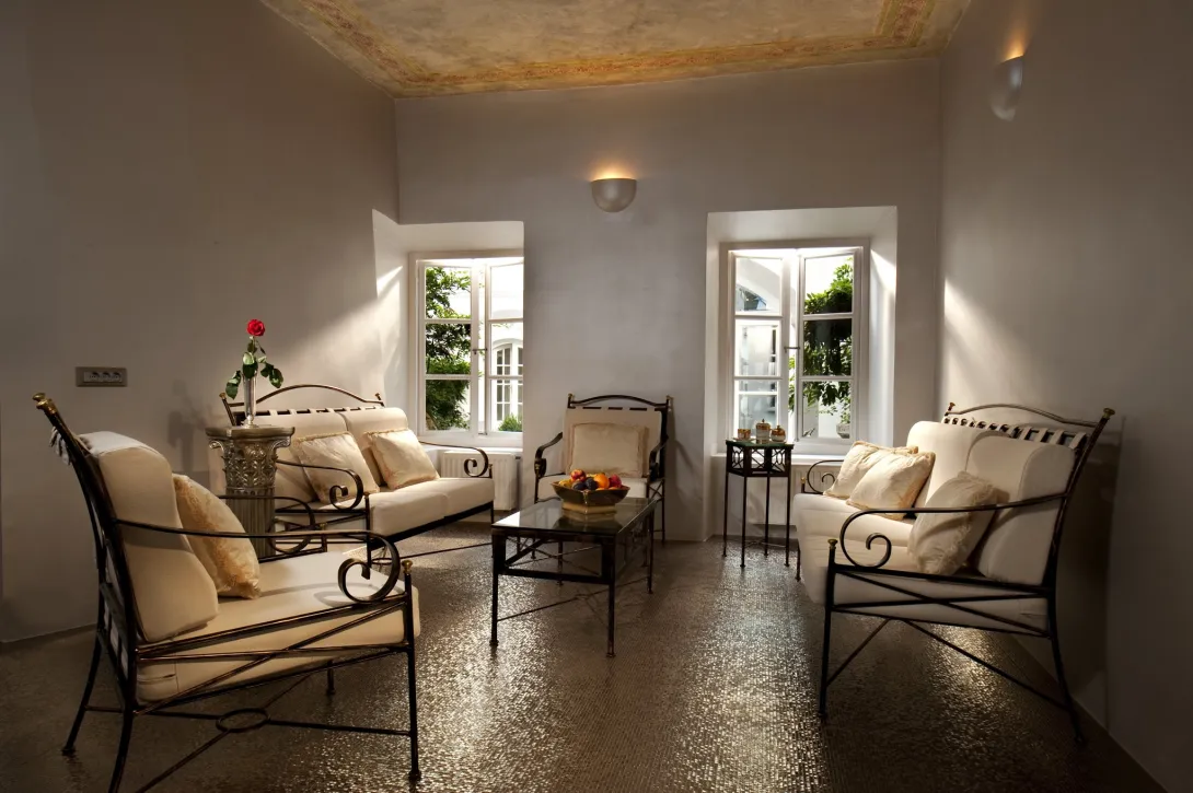 Há uma sensação palaciana em todo o Antiq Palace realçada por seus tectos altos, alguns dos quais são adornados por frescos com 300 anos, passagens intrigantes e paredes e janelas originais. As 13 suites e as quatro residências duplex oferecem um quarto principal, sala de estar, cozinha totalmente equipada, área para refeições e casa de banho.