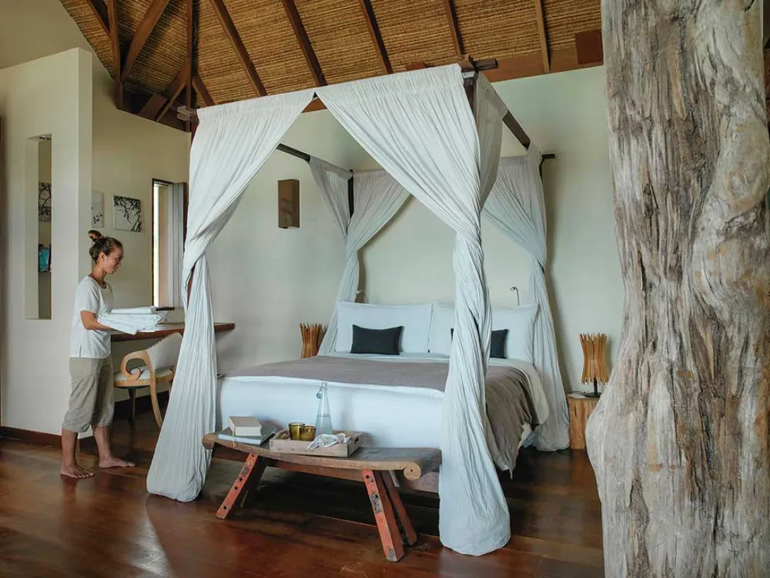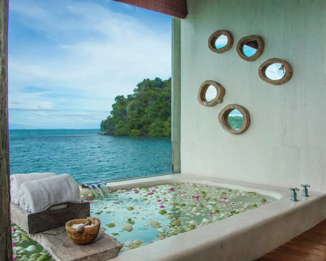 Algumas villas estão instaladas em palafitas sobre as águas ao estilo Fiji; outras estão na praia e o oceano é a varanda da frente; e outras ainda aninham-se na encosta florestada, mais isoladas.