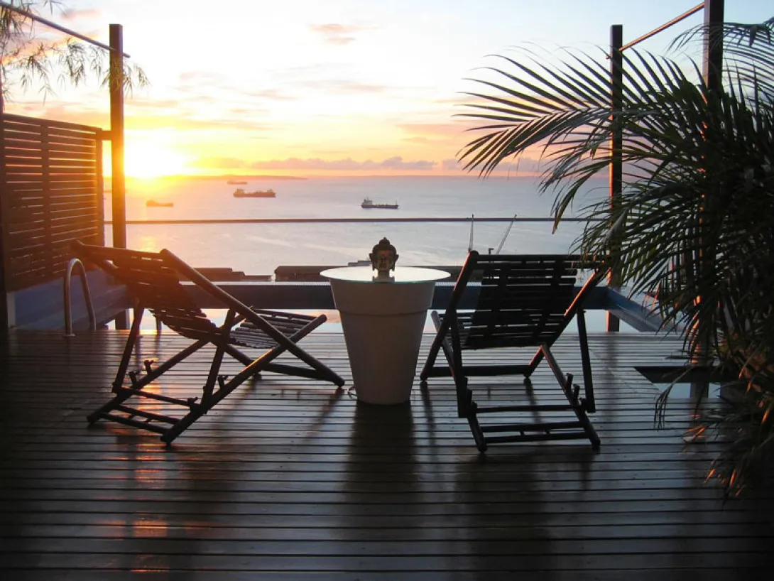 Uma dessas piscinas é privada e localizada dentro do quarto do primeiro andar, uma suite com dois quartos, que inclui ainda um terraço, tornando-a perfeita para dois casais ou uma família pequena. A outra fica no terraço do hotel, com uma vista sobre a baía completamente desobstruída.