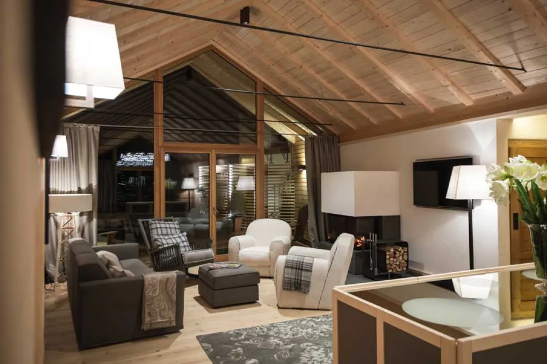 O chalet foi construído nos mais altos e recentes padrões de construção, madeira e vidro, com janelas do chão ao tecto para maximizar a luz e capturar as vistas deslumbrantes sobre as rochas cor de rosa dos picos Dolomitas.
