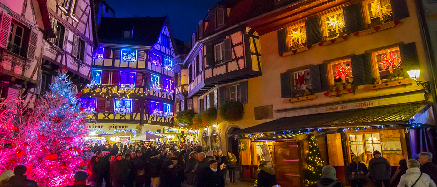 A região da Alsácia, situada perto da Alemanha e da Suíça, oferece aos visitantes um vislumbre emocionante de 1000 anos de história europeia, especialmente na época do Natal. Transforma-se num mundo maravilhoso feito de lendas, tradições, mitos, cheiros e sabores. O ambiente de Colmar assemelha-se a um autêntico conto de fadas - a zona histórica da Cidade Velha torna-se mágica com as iluminações de Natal que, neste período festivo, combinam harmoniosamente com a iluminação existente, que realça a herança da cidade e coloca uma aura de luz suave sobre o centro de Colmar.