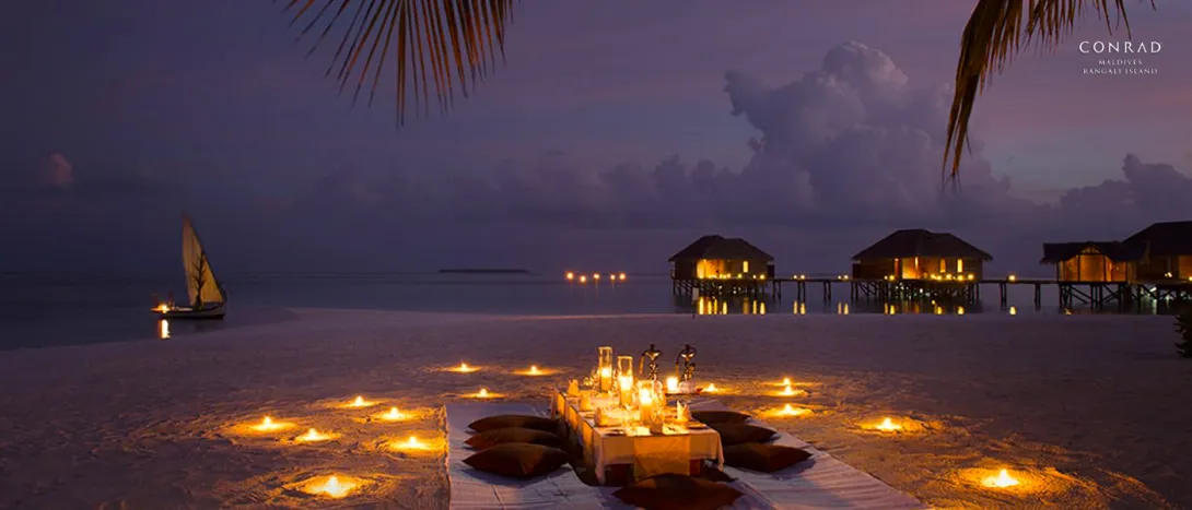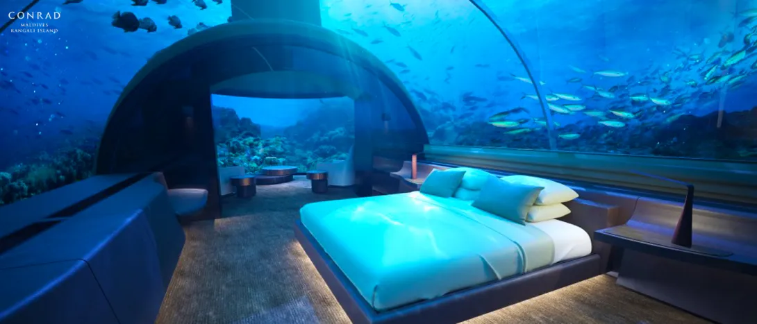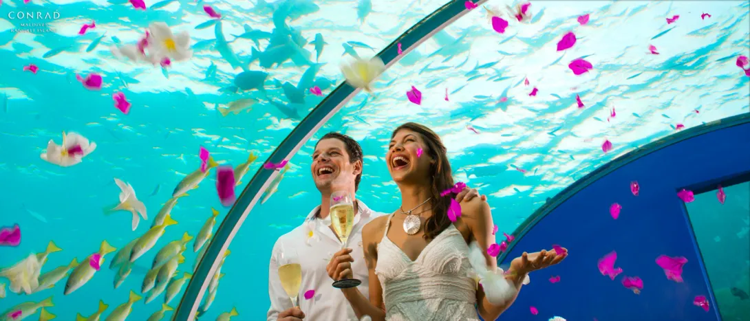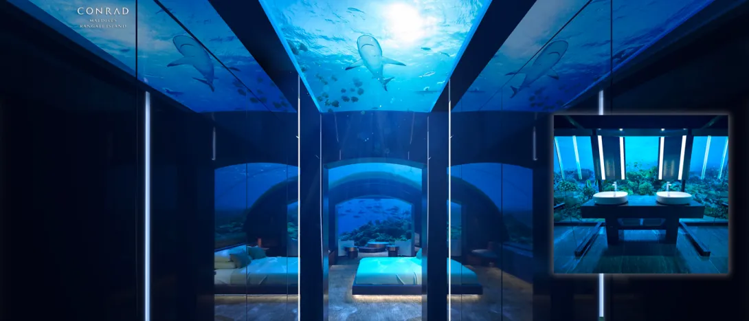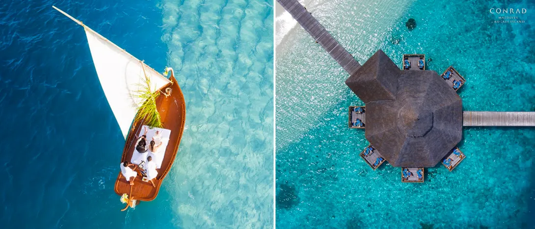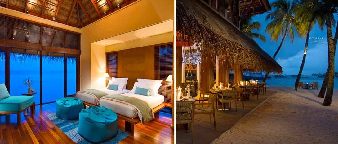Descubra uma perspectiva completamente nova sobre a vida acima e debaixo de água no premiado resort de luxo Conrad Maldives Rangali Island. Distribuído por duas ilhas com villas, três spas e a melhor experiência gastronómica das Maldivas, este resort proporciona uma vivência inédita com o seu restaurante submarino Ithaa, o único do género no mundo. Jante cinco metros abaixo da superfície do oceano, com uma vista panorâmica do jardim de corais a acompanhar os menus de fusão, combinados com vinhos finos.