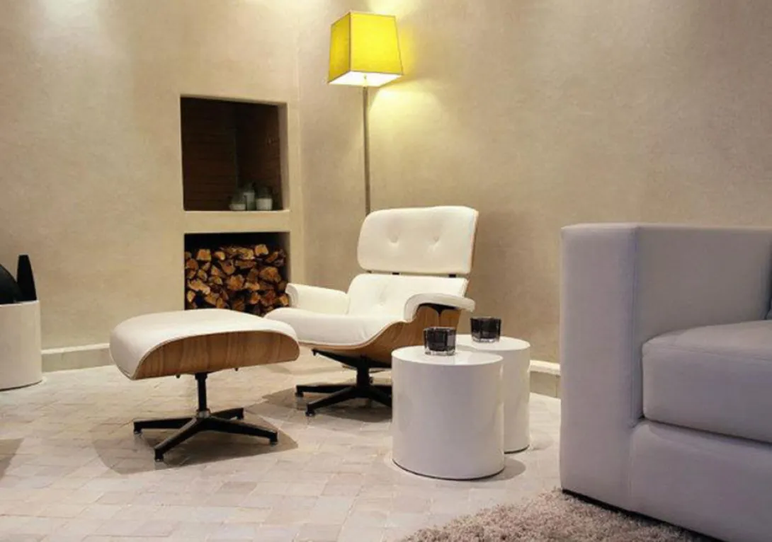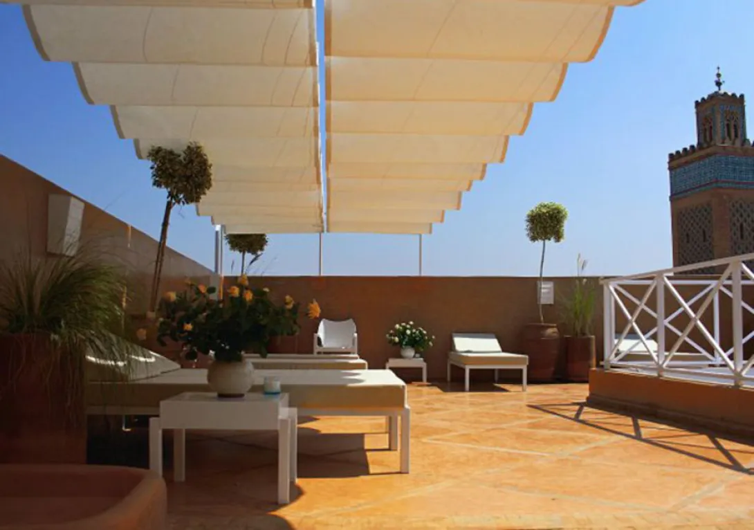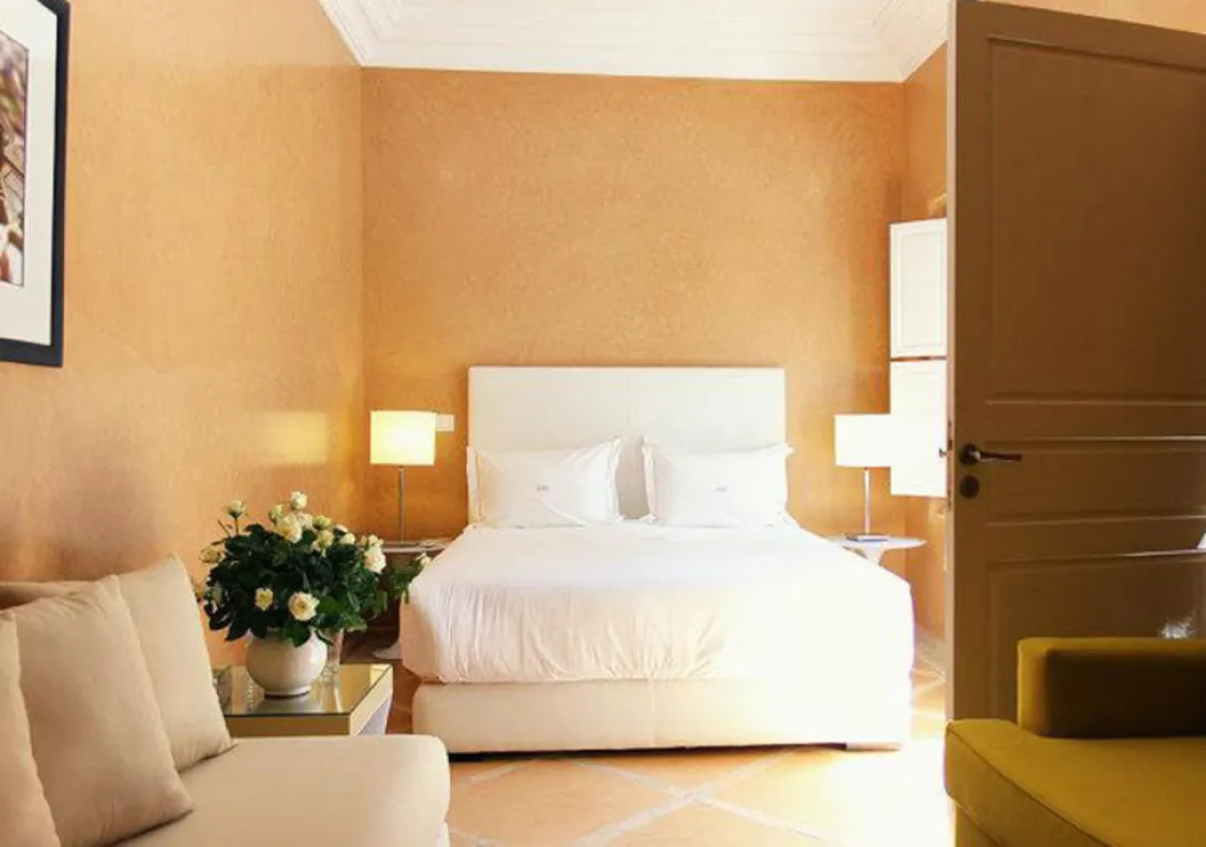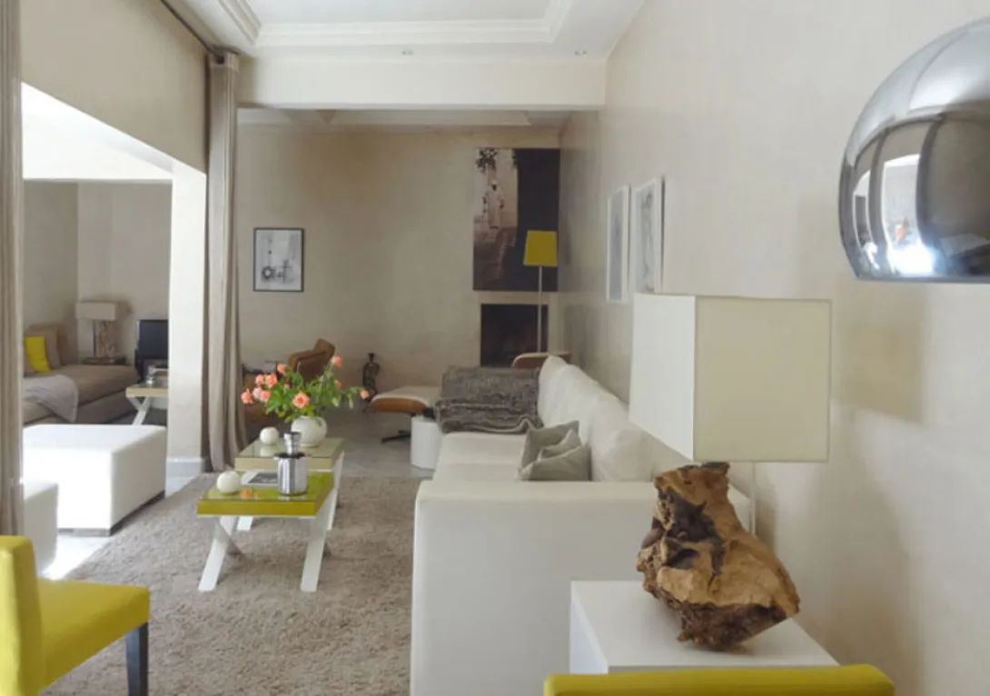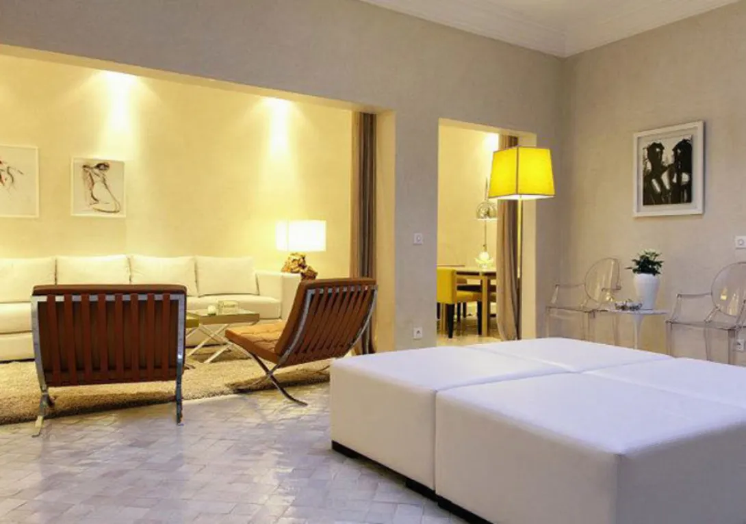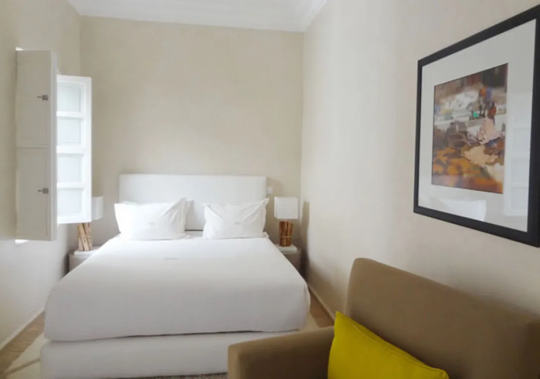 Riad Dar White é uma secreta jóia branca, mistura de design contemporâneo, tradição marroquina e modernidade impressionantemente escondido em um dos muitos becos da Medina de Marrakech, bem no meio do labiríntico charme da Kasbah, poucos minutos a pé das Tumbas Saadianas.Como o nome sugere, o branco é o tema dominante, adensado por sombras leves de castanhos, beiges, vermelhos e cinzentos. Contra as paredes branco e caramelo, as camas brancas com os seus lençóis brancos de linho acenam sedutoramente, enquanto as poltronas, abajures, tapetes grossos e almofadas macias amarelas trazem cor e calor.é um toque de modernidade, e a arquitectura, com as suas portas em arco e o pátio aberto para o céu azul, acima, recorda-nos que estamos no interior da medina.Irmão mais novo do Dar One, o proprietário Jean Peres projectou o Dar White como uma casa relaxada e extremamente confortável.Os quartos que levam nomes como Ibiza, Mykonos,Saint Tropez ou Portofino, estão decorados com o tradicional branco "tadelakt" num mix de cores elegantes, do branco ao caramelo. Cabedal branco, cortinas elegantes e modernos candeeiros "New Edge" dão-lhe um design original e um touch contemporâneo. Todos com ar condicionado, têm uma sala de estar, acesso Wi-Fi gratuito e casa de banho com secador, roupão de banho e banheira ou chuveiro.O lounge é perfeito para chill out in, e a açoteia em terracotta, com as suas lounge beds e o jacuzzi exigem uma força quase sobrenatural para sair dali...O riad pode servir pratos marroquinos a pedido.