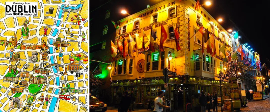 Situada nas margens do Rio Liffey, Dublin é uma das maiores e mais antigas cidades da Europa. É uma capital onde o visitante vai encontrar mais de mil Pubs - onde se degusta a cerveja Guinness ao som dos U2, a banda local de sucesso mundial - elegantes construções da época georgiana, praças, parques, teatros e edifícios históricos, como o Trinity College - antiga universidade, fundada em 1592 e que alberga o Livro de Kells, uma espécie de tesouro nacional (um evangelho iluminado à mão do século VIII), entre uma série de outros pontos de grande interesse.