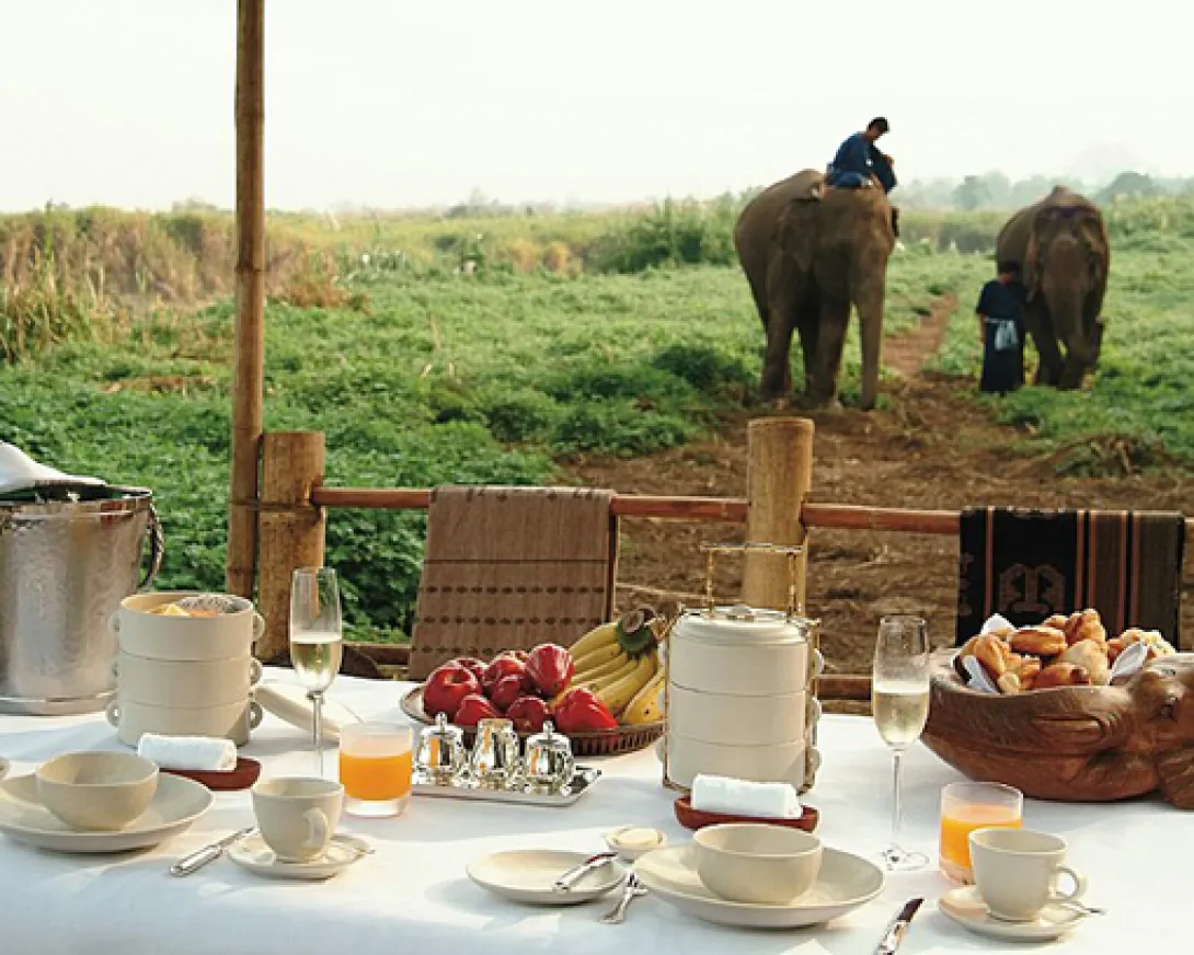 Chega-se ao Four Seasons Tented Camp Golden Triangle, na Tailândia, de barco, numa viagem pelo rio, entre cerradas selvas de bambu, no exacto lugar onde três países se encontram... uma experiência para adultos activos. Com apenas 15 tendas - com todo o luxo característico dos Four Seasons - estas aventuras tudo incluído de três ou quatro noites cobrem todos os detalhes, de elefantes mahout treinados a excursões ao Triângulo Dourado (Golden Triangle); de jantares formais em redor da fogueira a drinks no bar com vista para o rio.HIGHLIGHTSExtraordinária localizaçao ao longo do rio Ruak, isolado, tendas com ar condicionado, sundeck privado com camas de massagem, banheiras em cobre trabalhado e enorme chuveiro exterior.Várias opções de refeições, de piqueniques a jantares no campo: Nong Yao Restaurant para cozinha tailandesa, lauciana, burmanesa e internacional; Burma Bar, com vista sobre o Elephant Camp; jantares vínicos e provas.Dois jungle spa pavilions com salas para tratamentos de casais; massagens individuais nas tendas.As actividades disponíveis incluem ainda treino de elefantes, birdwatching, pesca, excursões pelo rio, passeios pela selva que rodeia o campo, aulas de cozinha local, de artesanato e de costumes.Piscina exterior e whirlpool; acesso internet de alta velocidade; loja de joalharia e artesanato local.