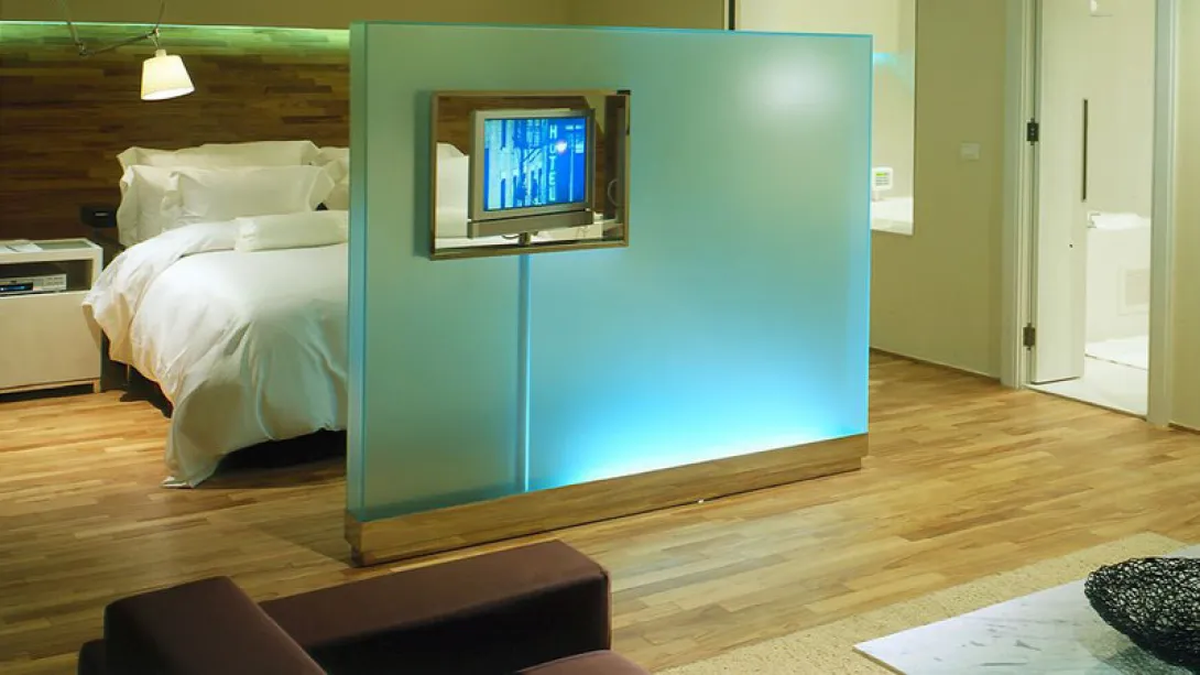 Os seus 95 quartos podem não ser tão exagerados quanto a estrutura, mas têm os seus prórpios floreados! São curvos nas pontas, juntando-se ao arco da parede externa, e o mobiliário estende-se, quase como uma brincadeira, até aos cantos superiores. As casas de banho são vanguardistas, com divisórias que correm e os separam (ou não) das banheiras transparentes nos quartos.