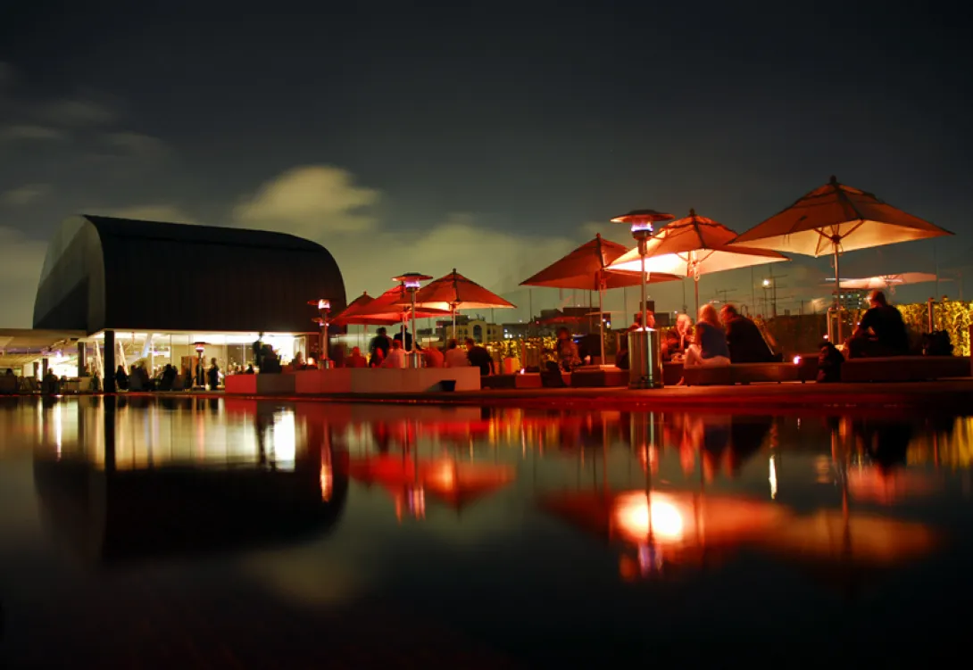 Por outro lado, o hotel parece-se com um barco - a fachada é de cobre envelhecido com janelas circulares como vigias, e a curva da parte inferior, que seria a proa e a popa do navio, é coberta com madeira. Folhas muito finas de betão, quase como fitas, ancoram a popa e a proa ao chão (e evitam a aparente possibilidade de todo o conjunto cair). O lobby do úlitmo andar tem chão em madeira, como o deck de um velho navio, e a água fica aqui em cima na forma de uma profunda piscina vermelha que, teremos de admitir, parece mais decorativa que funcional.