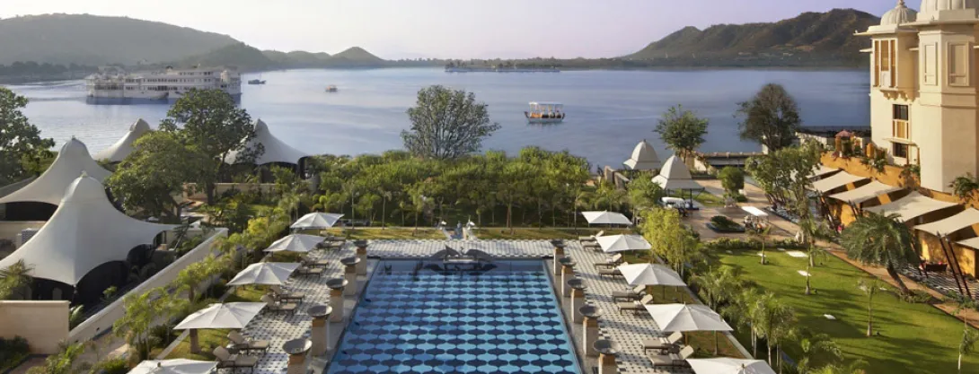 Pairando como uma miragem na margem do Lago Pichola, o The Leela Palace Udaipur define-se no céu nocturno da índia com as luzes dos seus 80 quartos acima da vítrea água...Imponente e orgulhoso, o The Leela Palace Udaipur fica na margem do mundialmente famoso Lago Pichola como um magnífico bolo de casamento, de cor creme com picos de branco-marfim. Ali bebe-se nas vistas panorâmicas das montanhas Aravalli e dos palácios históricos que datam de há séculos.A decoração é a adaptação de um palácio real e colonial, mas aprofundada com ricos tons culturais indianos. Não importa qual o quarto que se escolha, pois qualquer um desfruta de vistas espectaculares sobre o lago, as montanhas, ou a intrincada arquitectura da cidade.Embora, claro, inclua todas as modernas comodidades, o The Leela Palace também faz um esforço para oferecer shows e charmosos serviços com um toque local e colonial. Antes de uma ida ao spa ESPA, sente-se no pátio interior a conversar, delicadamente, sobre uma chávena de chá, jogue badminton ou croquet nos jardins, pratique yoga antes de começar o dia (ou, alternativamente, use-o para relaxar à noite). E, claro e obrigatoriamente, inscreva-se para uma sessão com o astrólogo do palácio e aprenda a ler as estrelas...
