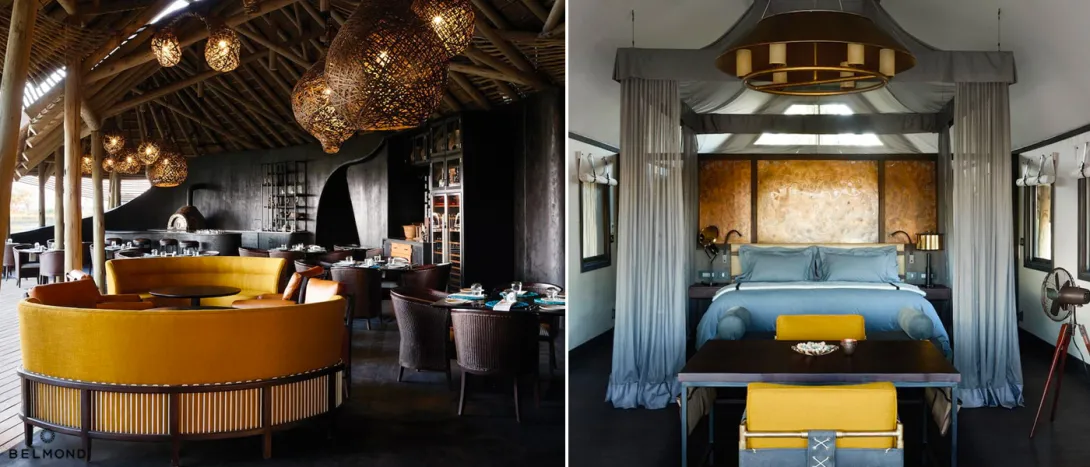 O Belmond Eagle Island Lodge proporciona uma vivência de luxo intemporal nesta região do Botswana - Quartos em tendas com tecto alto que se inundam de luz, cada com uma piscina de imersão e uma cama grande com vista para o delta do rio.