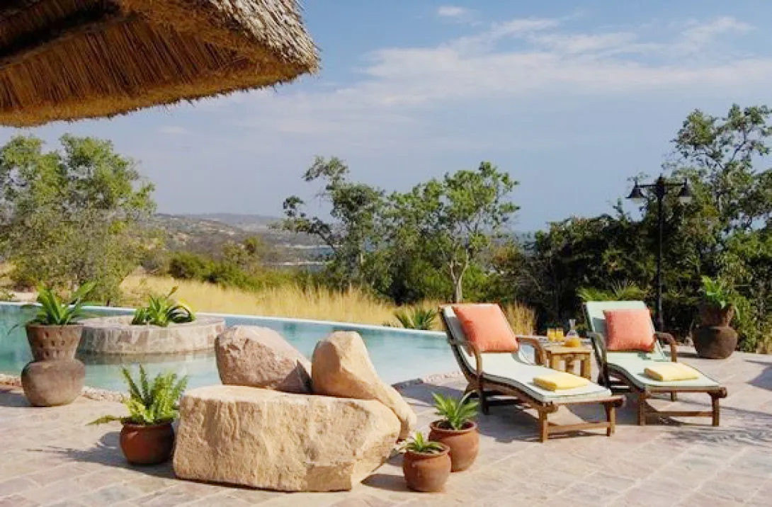 O único hotel da ilha é pequeno (11 villas e 2 cottages) e mistura o charme rústico (telhados de colmo) com puro luxo (por exemplo banheiras exteriores para descansar depois da sesta da tarde e assistir ao pôr-do-sol).