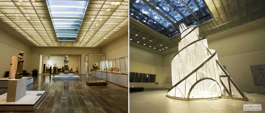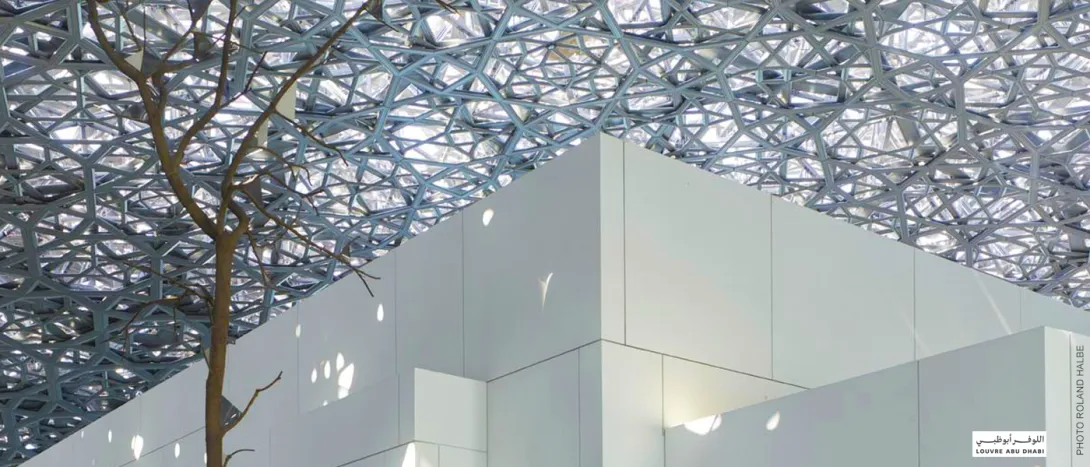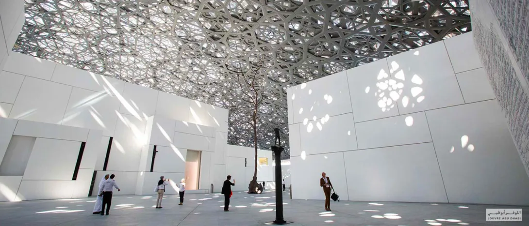 O Louvre AD possui um sistema de água inspirado no “aflaj” que atravessa todo o museu, baseado na antiga engenharia árabe. A cúpula de renda geométrica foi inspirada nas folhas de palmeira entrelaçadas tradicionalmente usadas como material para telhados e resultando numa “chuva” de luz encantadora. O padrão complexo do telhado é o resultado de um mesmo desenho geométrico repetido, que confere à cúpula uma forma rendada e delicada.