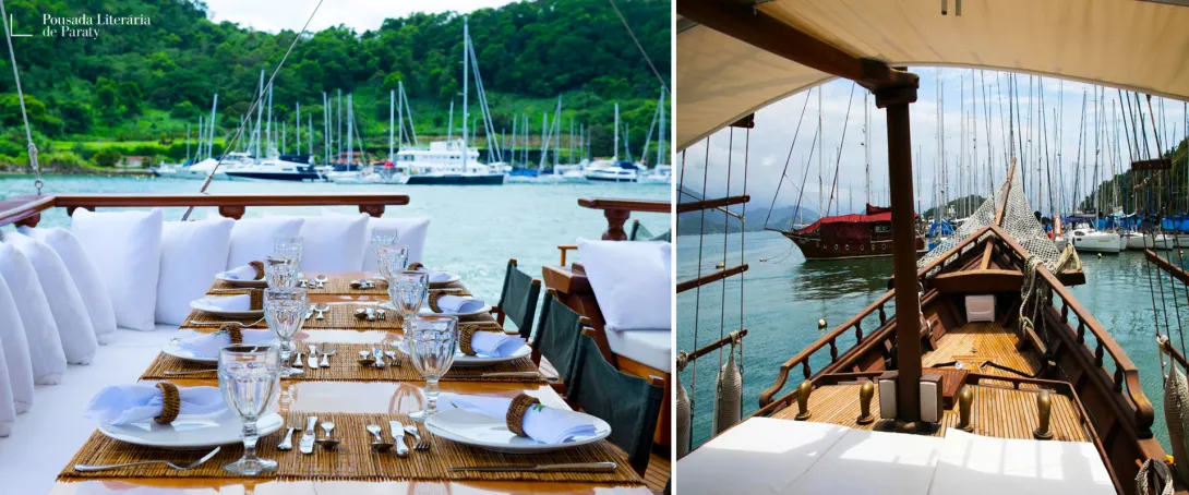 - 2 Barcos motorizados disponíveis com todos os equipamentos de lazer no mar, levam os hóspedes para uma zona protegida a 30 minutos do porto de Paraty. A bordo a chef Cláudia Mascarenhas recebe os convidados com cocktails e um almoço no final da experiência.