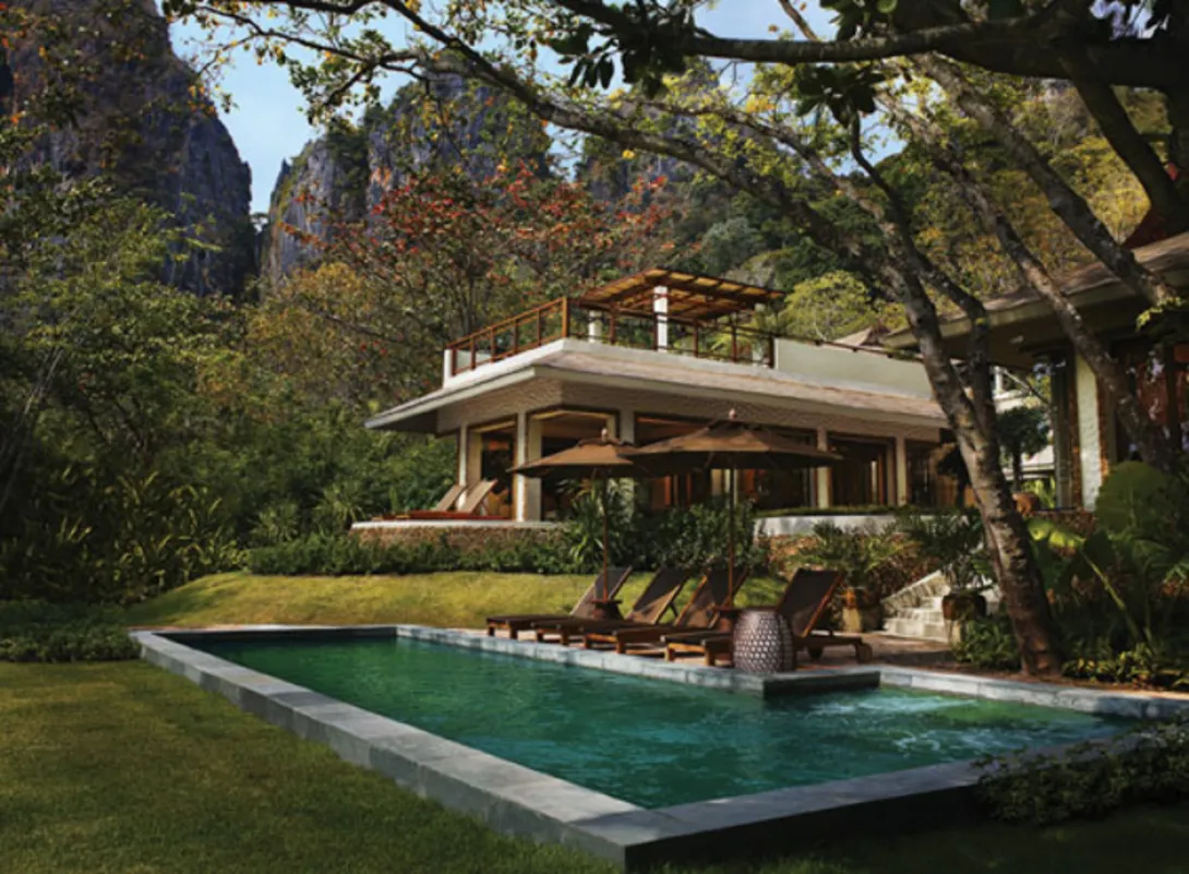 Rayavadee fica numa extremidade do Parque Nacional Marinho de Krabi, no coração da deslumbrante Península de Phranang, em perfeita sintonia com a natureza, rodeado por uma vegetação frondosa, falésias calcárias, praias de areia branca e a celebérrima água verde-esmeralda do Mar de Andaman. A sua premiada arquitectura e a paisagem tropical foram criadas sob inspiração da atmosfera típica de uma vila do sul da Tailândia.Apesar de não estar muito longe da fervilhante e vibrante Phuket, Rayavadee parece estar noutro planeta. Membro da Leading Hotels of The World, é um lugar que oferece privacidade e isolamento - aliás, a única forma de se chegar ao resort, na dramática Península de Phranang, no sul da Tailândia, é de barco. Ao aproximarmo-nos, uma parede de pedra parece emergir da exuberante vegetação da península. Depois, espalhados por toda a propriedade, há cerca de cem pavilhões e bungalows inspirados na beleza natural de um tradicional vilarejo tailandês.As acomodações vão de suites luxuosas a ostentosos bungalows, mas nenhuma deixa algo a desejar. O design circular dá uma sensação aberta e arejada a um espaço já abundante, e janelas grandes destacam o interior em relação ao verde da paisagem exterior. Para os hóspedes que desejam o tipo de solidão que as praias de areia branca não podem oferecer, alguns dos bungalows tem piscinas particulares - situado na parte mais elevada, essa área a céu aberto oferece também banheira e espaço para entretenimento.O resort oferece também quatro restaurantes e um spa, luxuosa lembrança do antigo conceito de bem-estar tailandês. Os que preferem a terapia das compras não precisam em preocupar-se com o isolamento do resort: há um shopping center na propriedade, onde se pode apreciar o trabalho de artesãos locais.