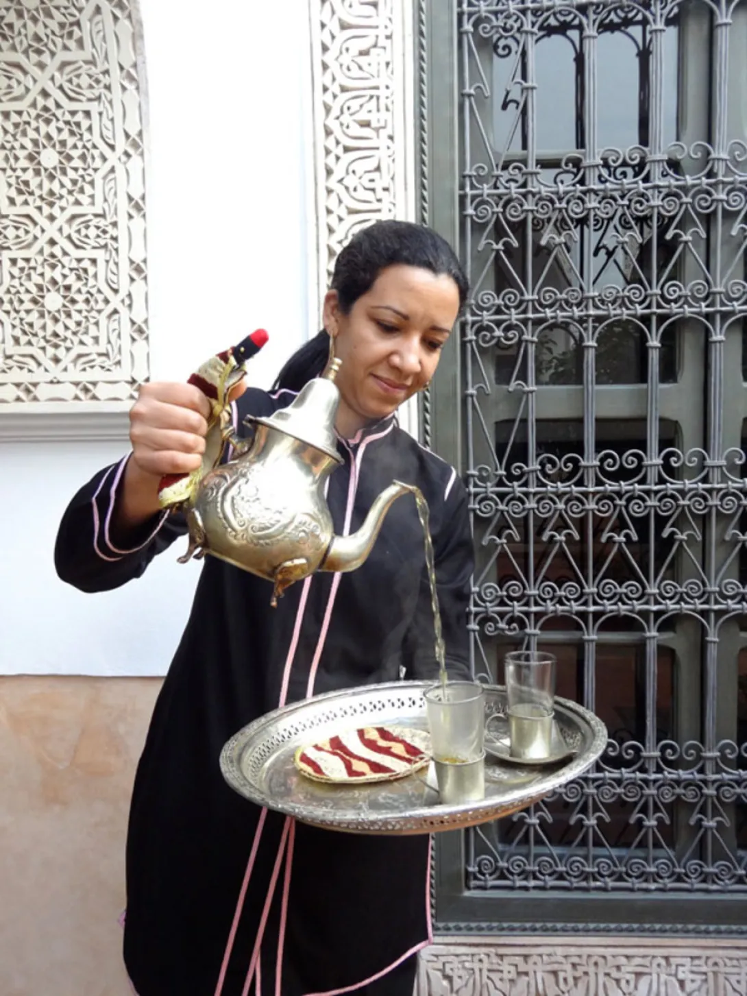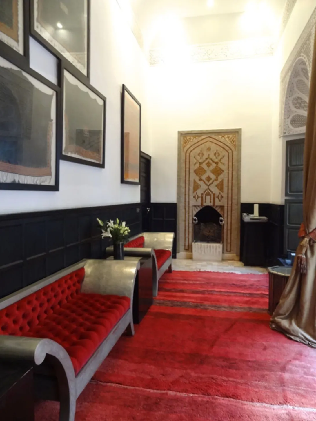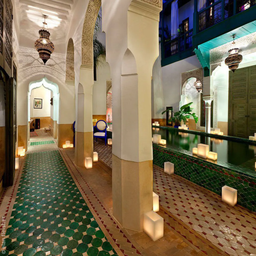 Escondida num pequeno derb, no final de uma estreita e minúscula rua a norte do soukh, entre o Museu de Marrakech e a Maison de la Photographie, fica uma pesada porta trancada, de madeira, sem nenhum sinal, apenas um sino.Uma vez aberta, entramos num mundo diferente, de tranquilidade, onde o ruído das motoretas, dos comerciantes, das crianças e das mulas é substituído pelo chilrear dos pássaros, da água murmurando... uma voz suave pergunta se gostaríamos de um thé á la menthe. Sentamo-nos então à beira da piscina, antes de subir uma antiga escada até ao quarto.Farnatchi foi convertido pelo pai do actual proprietário, um premiado hoteleiro britânico, que passou dois anos transformando os primeiros três riads numa casa de férias para os seus amigos e familiares. Decidiu depois mudá-lo para o seu uso actual, quando percebeu que os seus compromissos noutro lugar significariam que a casa teria de ficar vazia por longos períodos. Riad Farnatchi é agora uma bela casa, privada, mas com as facilities de um boutique hotel de 5 estrelas de classe mundial. O riad está instalado no coração da medina, perto da Medersa de Ben Youssef, e mesmo ao virar da esquina do super in Foundouk, o famoso restaurante. As áreas públicas do andar térreo são uma colecção de tradicionais e bem proporcionados quartos e pequenas alcovas - b"hous - com um dos lados abertos para um pátio interno. Quase peças únicas, o mobiliário foi especialmente desenhado e feito para o Riad Farnatchi - o seu estilo reflecte uma fascinante fusão do tradicional marroquino e do moderno design europeu. Todas as 9 suites incluem lençóis de algodão egípcio, televisão, dvd, cd, telefone, pontos de internet, ar condicionado e aquecimento central. Todas, excepto uma, dispõem de lareiras desenhadas individualmente para que se enquadrem em cada quarto de uma forma particular. O mobiliário, fantástico, é também super confortável, e os quartos dispõem ainda de luz ajustável para que sejam práticos ou românticos.Todas as suites dispõem de grandes casas de banho em mármore recheados de produtos de banho da britânica Molton Brown. O pequeno almoço, tradicional, é servido no quarto, na varanda, nos b"hou perto da piscina ou no terraço, sob o céu azul de Marrakech. Tudo o que imaginar se possa é feito em casa, desde o pão berbere às geleias (por exemplo de laranja-canela, cenoura-limão, kiwi-menta ou rosa-morango). O Riad Farnachi tem um cozinheiro berbere que cozinha o pão e é o génio criativo por trás de toda a comida da casa, servida numa soberba sala de jantar iluminada à luz das velas. Cada refeição é preparada individualmente, segundo o gosto de cada hóspede, ainda que apenas seja servida cozinha marroquina. Antes do jantar - jante-se ou não no hotel - são oferecidos canapés na sala de jantar iluminada por candelabros, nos B"hou , no terraço ou mesmo na tranquilidade da sua suite. O Riad tem um hammam revestido a mármore branco, mas apenas acessível by appointment. Oferece deliciosas massagens exfoliantes, tratamentos com óleo de argan, argila e outros produtos preparados na tradição marroquina e que incluem ingredientes naturais. A piscina - aquecida no Inverno e refrescante no Verão - é uma presença verde no primeiro pátio, e durante todo o dia ouve-se o suave murmurar da água caindo numa das extremidades.<