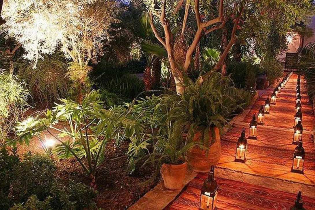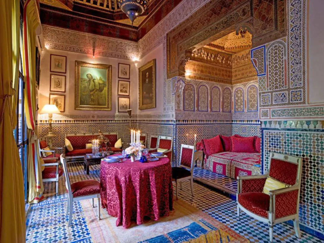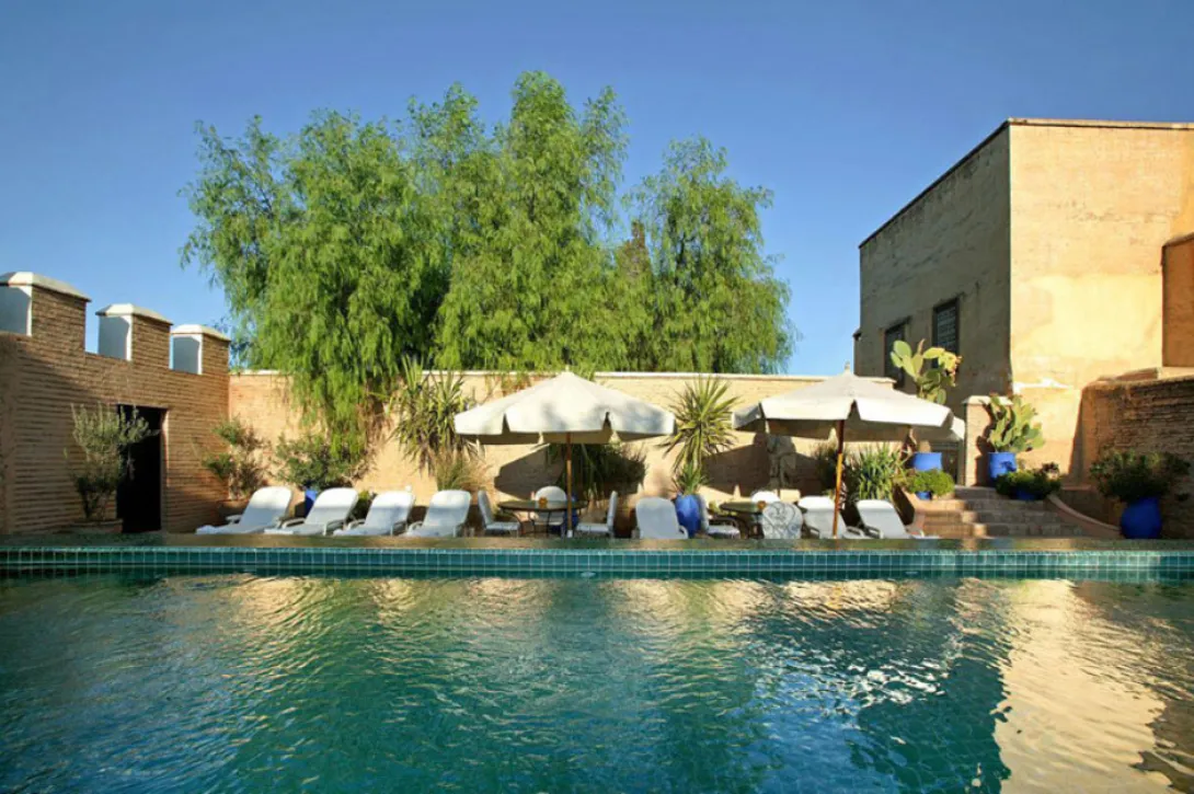 Riad Madani é uma mansão de meados do século XIX, uma das mais bonitas da cidade imperial, tanto pela sua arquitectura e decoração como pelo seu grande pátio com mil metros quadrados - um dos maiores da Medina de Marrakech.Este Riad carregado de história foi lugar de recepção dos diferentes chefes das tribos subordinadas ao grande Vizir Madani El Glaoui, que era o seu proprietário.Mais tarde, foi neste palácio que Marshal Lyautey realizou as negociações para a celebração do Tratado de Protectorado.Hotel de excepção, com uma grande piscina no terraço, oferece 15 quartos e suites todos decorados com obras de arte, transmitindo a esta histórica mansão um charme único, para além da sua incomparável arquitectura tradicional, com zelliges, tectos de madeira trabalhados e delicadamente pintados.Instalado numa superfície total de 3500 metros quadrados, o riad oferece: magníficos salões, belos terraços preparados para o descanso e uma grande piscina esmeralda com 70 metros quadrados.O Riad Madani fica na pacatez de uma pequena ruela que dá para o animado Derb Dabachi, mesmo ao lado da praça de Jemaa El Fna (poucos minutos a pé). Os quartos e suites:Graças à sua arquitectura mourisca, com pátios e corredores de passagem, a disposição dos 15 quartos (seis em redor do grande pátio) é dispersa, permitindo uma grande intimidade a cada hóspede.La Masriaé uma belíssima suite de inspiração oriental situada no primeiro andar. Quarto duplo com biblioteca e tecto alto (4,35 m) pintado em negro e ouro. Um grande salão com tecto antigo em madeira pintada (Zouak), com lareira, belas gravuras turcas do século XVIII e um retrato do sultão Abdelaziz, sultão à época de Madani el Glaoui.L"AfricaineQuarto situado sobre o grande pátio e o jardim, com lareira, e um terraço sobre o jardim, decorado sob o tema "Africaniste", com uma série de desenhos de meados do século XX.L"OrientaleQuarto situado sobre o grande pátio e o jardim. Decoração subordinada ao tema Orientaliste, tapetes e gravuras orientalistas de época, com lareira.La Chinoise Quarto situado sobre o grande pátio e o jardim. Decoração requintada, pinturas chinesas sobre tela do século XIX, e quadros de época.La DoréeQuarto situado sobre o grande pátio e o jardim, móveis e tecidos de época, e o tapete de elefante do Maharaja de Bikaner utilizado na coroação do rei Eduardo VIIII, na índia. No salão uma lareira, quadros de época sobre o tema os índios da América, belos tectos pintados e pequena biblioteca.La TourGrande quarto com tecto alto instalado no primeiro andar e com dois níveis: casa de banho em baixo e o quarto em cima. Muito luminoso com vista para o pátio e os telhados da Medina. Acesso directo ao terraço da piscina. Decoração cuidada, tapetes e móveis de charme e gravuras de Picasso, em edição numerada, sob o tema Toros y Toreros.Cour des BananiersQuarto no rés-do-chão, revestido por uma tela pintada por Lila De Nobili e azulejos tradicionais, com quadros africanistas e uma lareira em mármore negro. Duas grandes janelas que se abrem para um pátio privado com azulejos de motivos tradicionais, rodeado por bananeiras e perfurmados jasmins.Harem - Chambre ChinoiseAmplo quarto no prim