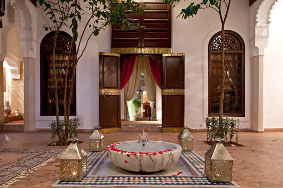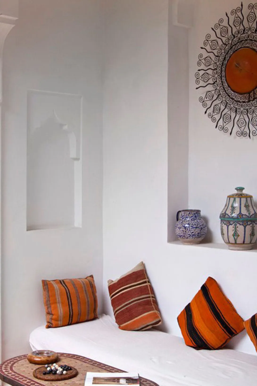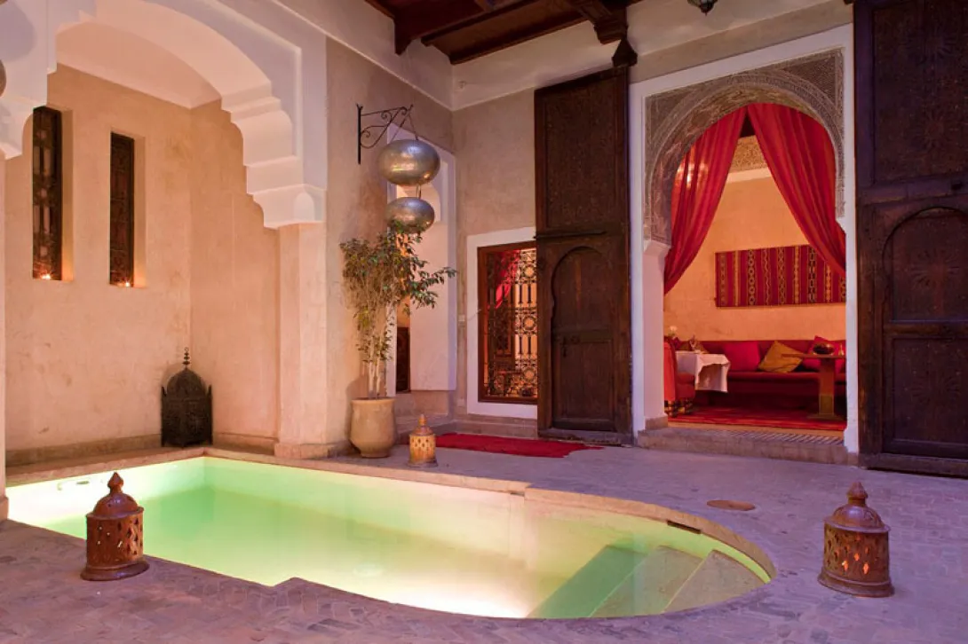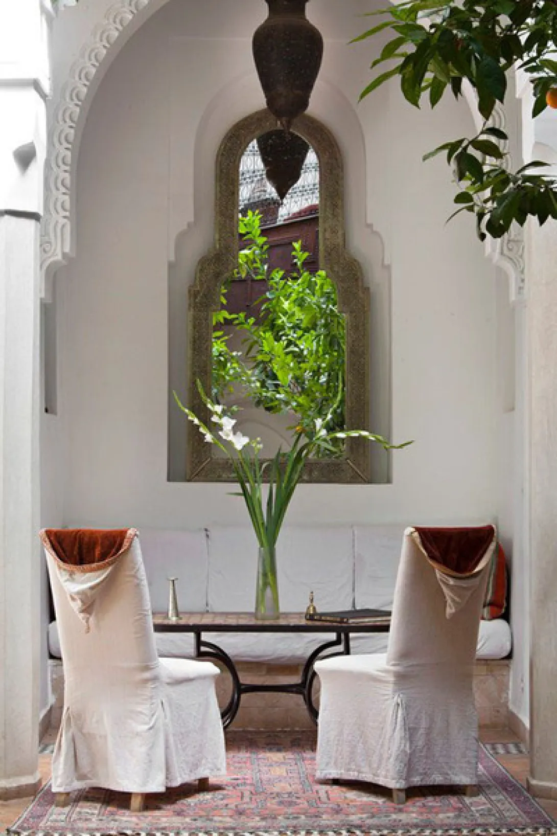 Situado em Mouassine, este riad tem dois pátios, uma pequena piscina com máquina de contra-corrente, açoteia, sala de massagem, um hammam e seis quartos e suites.A palete de cores do Riad Zolah evoca a medina marroquina: contra um pano de fundo completamente branco de colunas, móveis e paredes, cintilantes metros de seda adornam os nichos e alcovas; sedas em tons de rosa, laranja, vermelho e roxo enfeitam arcos elaborados; coloridas almofadas listradas, de tecidos feitos à mão e tingidos da Medina, adornam os confortáveis sofás... Cada uma das seis suites e quartos têm ar condicionado e aquecimento - alguns têm lareiras para aquelas romanticamente acolhedoras noites de Inverno de Marrakech!Com lençóis de algodão egípcio, roupões de banho de luxo e produtos de higiene pessoal, babouchas como cortesia, cofre, Bose iPod docks e WiFi em todo o lado, os hóspedes desfrutam ali de uma experiência completa, independentemente da escolha do quarto ou do orçamento disponível.Os quartos não têm, propositadamente, televisões, mas o Riad Zolah coloca à disposição dos hóspedes, gratuitamente, de leitores de DVD portáteis e de uma biblioteca de filmes digitais on-demand.Se optar por jantar chez Zolah, seja ao pôr do sol no fabuloso terraço, na sala de jantar, ao ar livre à beira da piscina, ou no seu próprio quarto, o chef apresenta sempre o melhor do mercado do dia - basta dizer de manhã que gostaria de jantar no riad nesse dia.Zolah dispõe ainda de um pequeno hammam, de uma sala de massagens e serve a cada hóspede, à chegada, um telemóvel com o número de telefone do Riad pré-programado.