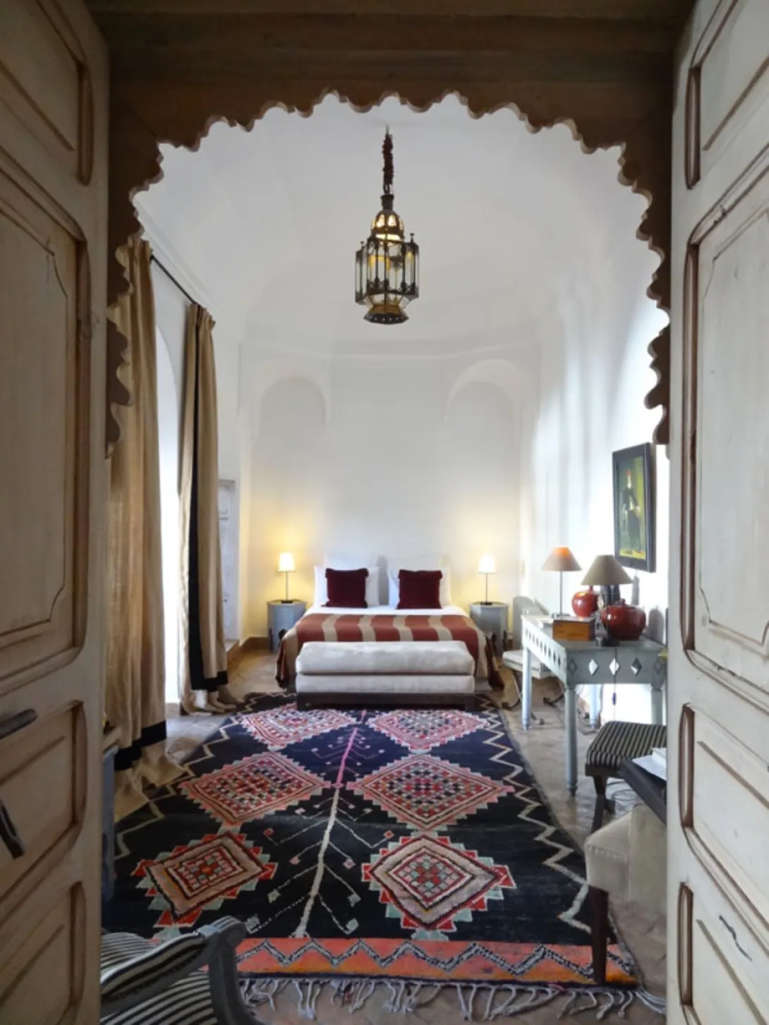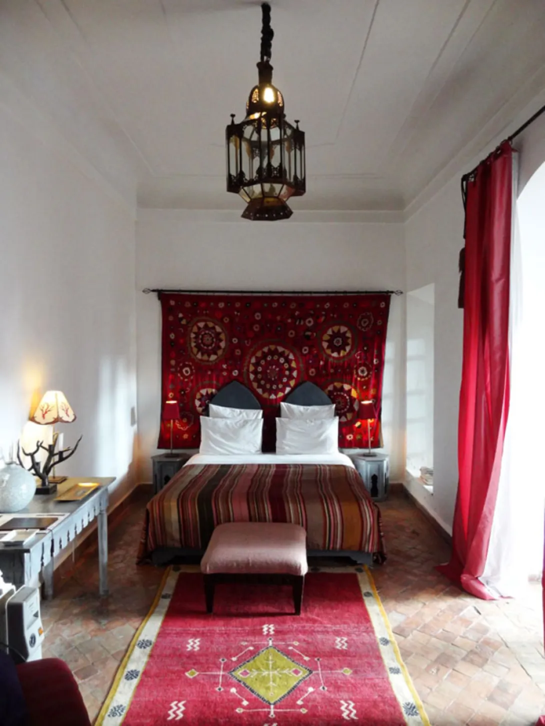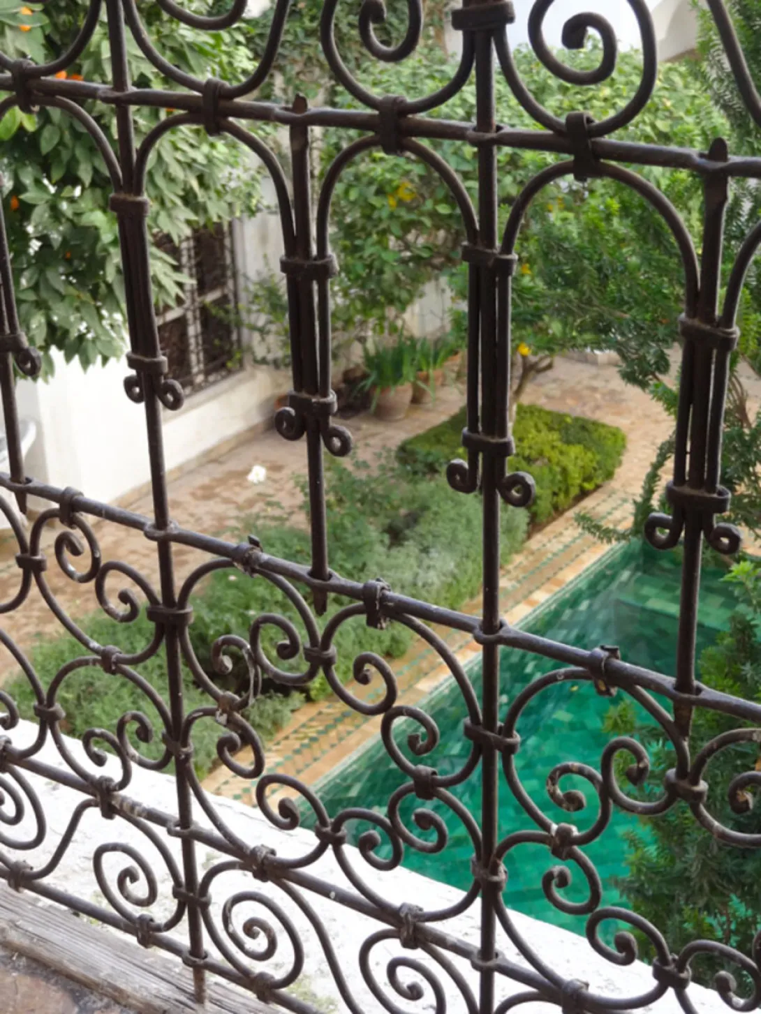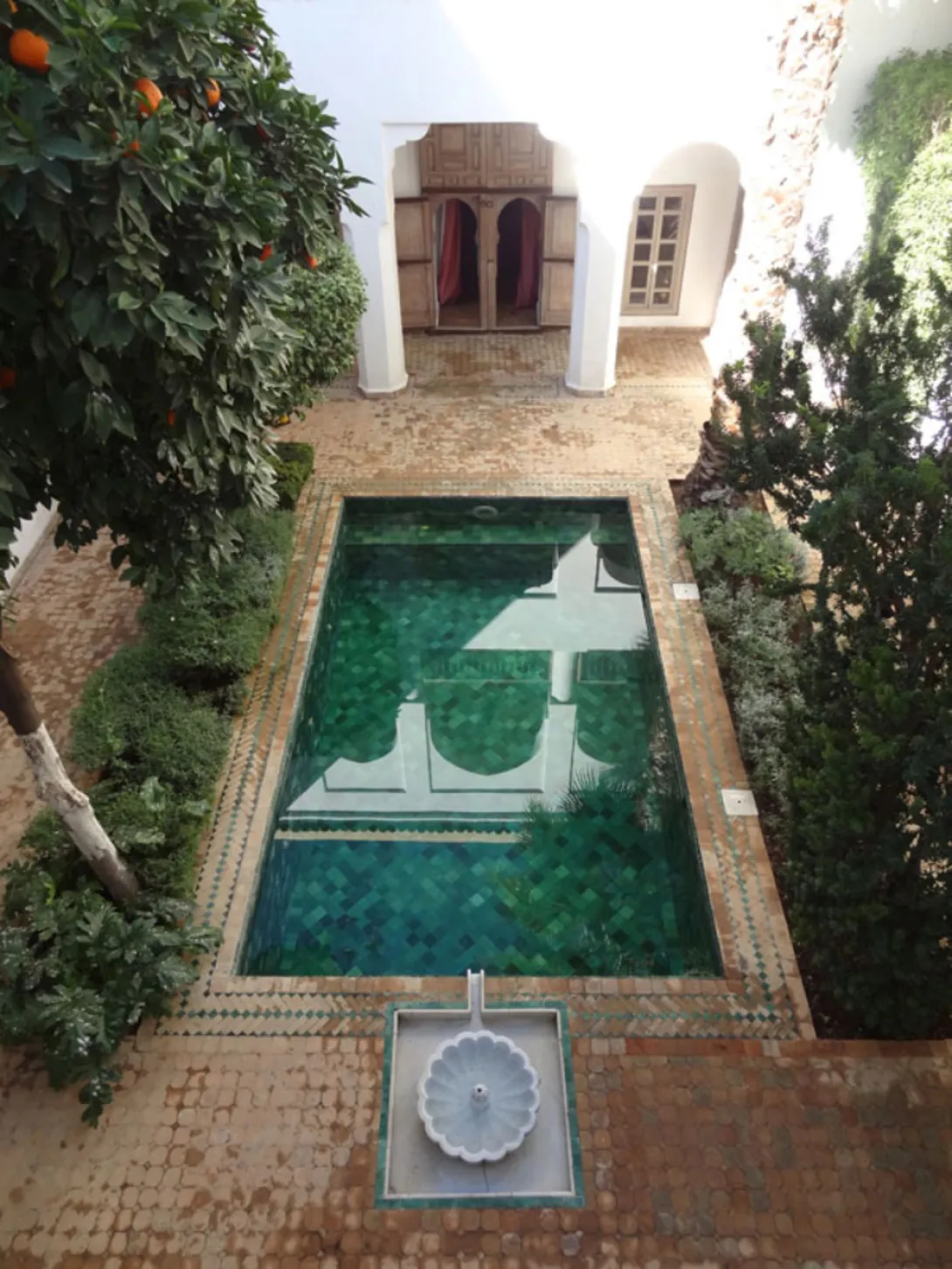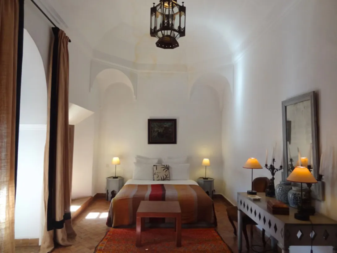 Próximo da famosa escola corânica Medersa Ben Youssef, num dos mais antigos bairros da medina - em tempos habitado por famílias nobres originárias de Fez - a sua localização permite aceder rapidamente aos souks ou à praça Jemaa El-Fna.Com um rico passado histórico, este palácio do século XVIII deve o seu nome à função de Mezouar (chefe de família) exercida pelo ramo da família real alaouita a quem o Riad pertenceu até 1945 - o riad recebeu aliás, com esse título, a visita do rei Mohamed V nos anos 40. O riad foi depois propriedade de Moulay Idriss Sbaï, caide de El Kelaasraghna, passando depois para os descendentes de Hammadi El Glaoui, califa de Ouarzazate e irmão do Pacha de Marrakech. Os actuais proprietários, Michel Durand-Meyrier e Jérôme Vermelin, adquiriram a propriedade em 1999, restaurando-a no completo respeito à tradição. A restauração e decoração do riad foram, aliás, realizadas num espírito de luxo e sobriedade onde imperou sempre o requinte. Durante a cuidadosa decoração da casa, os talentosos e apaixonados proprietários embelezaram-na recorrendo a uma fusão do oriente com um estilo sóbrio-contemporâneo.Os tradicionais materiais locais foram profusamente utilizados: tadelakt nas casas de banho, bejmat (tijolos de terracota de Fez), os objectos de arte e o mobiliário dispostos pela casa representam o estilo de Michel e Jérôme como uma mistura ecléctica de recordações das suas viagens pelo mundo, incluindo peças originais dos mundos árabe e Asiático. A arquitectura do Riad é excepcional: é um dos verdadeiros riads de Marrakech que inclui quatro fachadas de arcadas e de galerias dispostas em dois andares. Mas é sobretudo a elegância das suas fachadas e a harmonia das suas proporções que a transformam numa obre de arte do estilo árabe-andaluz. O imenso bassin , rodeado por plantas e árvores, ocupa o centro do pátio, com a sua fonte de mármore e os seus azulejos de faiança artesanal, evocando os bassins das antigas escolas corânicas (medersas). As duas galerias de colunas, que acompanham os quatro lados do riad, dão acesso aos quartos e ao andar térreo, permitindo aos hóspedes beneficiarem de um magnífico exemplo da clássica arquitectura deste tipo de casas.Sob as arcadas mouriscas descansa o grande salão interior - com a sua chaminé - os dois salões exteriores, a suite Alaoui e o quarto Turque. No primeiro andar, estreitas galerias conduzem à biblioteca, ao salão exterior Chinois, ao quarto Kubba e às suites Mezouar e Ambassadeur. A açoteia, com vista panorâmica sobre o Atlas e a Medina, está preparado para o prazer dos hóspedes, um lugar fantástico para saborear um copo de vinho, ler um livro, conversar ou, apenas, dormitar. O serviço inclui pequeno-almoço, soft drinks e chá, servidos durante toda a estadia. Refeições também podem ser preparadas a pedido dos hóspedes.