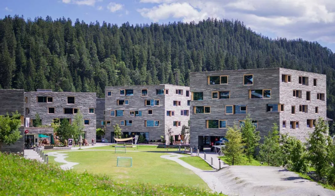 Em pedra áspera, o exterior cúbico deste hotel mistura-se subtil e inteligentemente com o seu ambiente, sem esquecer um design arrojado. Mais do que um simples hotel, este complexo de arquitectura minimalista em forma de cubo com edifícios, casas e apartamentos de férias mobilados, lojas, restaurantes e bares, organiza-se em redor de uma praça central.