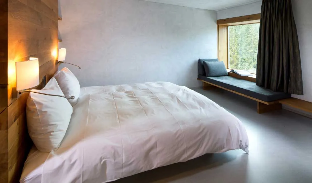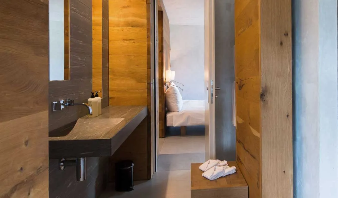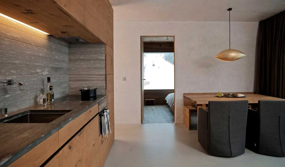 Dentro dos apartamentos minimalistas, pedra de quartzito local é usada para os topos de cozinha, paredes e casas de banho (que se transformam em banhos turcos e incluem banheiras em pedra). Uma área de estar em plano aberto tem uma boa e elegante iluminação, enquanto os quartos (dois ou quatro) têm os armários habilmente escondidos nas paredes de carvalho não tratado.