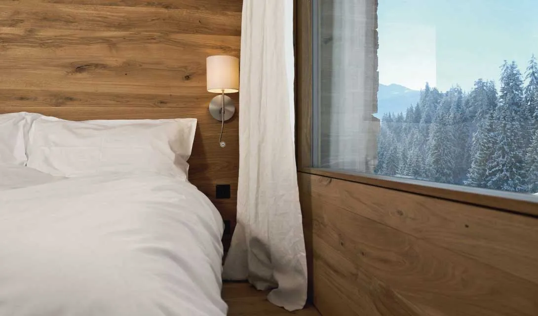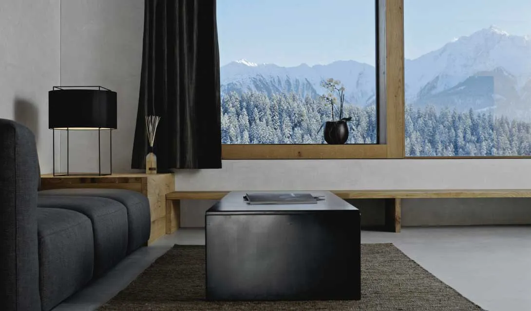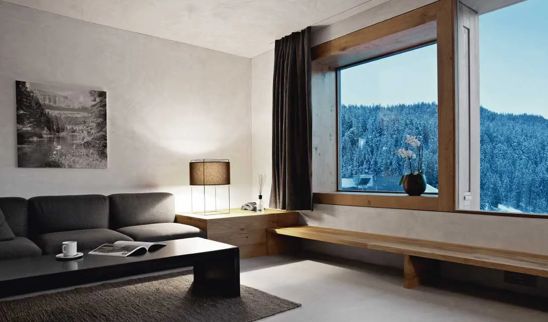 Os interiores reflectem o formato cúbico dos edifícios e apresentam materiais mais leves para contrastar com a paisagem imponente.