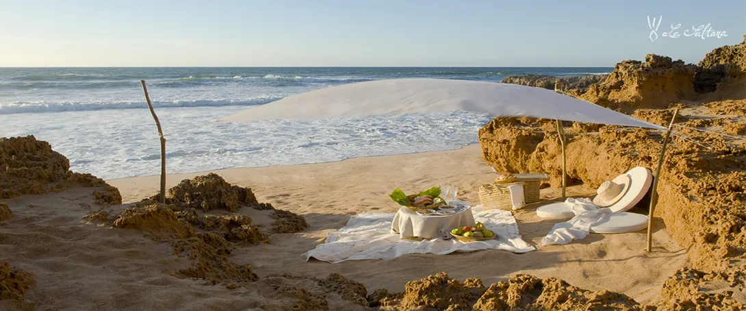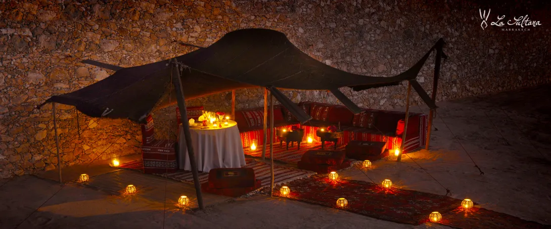 No La Sultana Oualidia, imagine o seu jantar romântico privado na piscina turquesa ou na lagoa situada no pontão do hotel. Inspirado no conto 'As Mil e Uma Noites', desfrute da atmosfera mágica de um jantar privado sob a tenda berbere, onde a areia é coberta com tapetes orientais e iluminada com a romântica luz de lanternas!