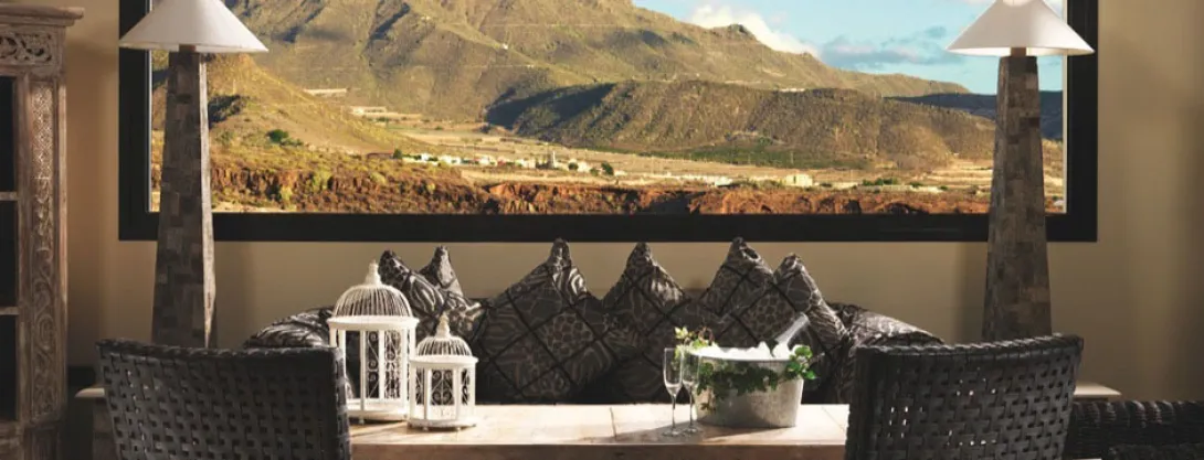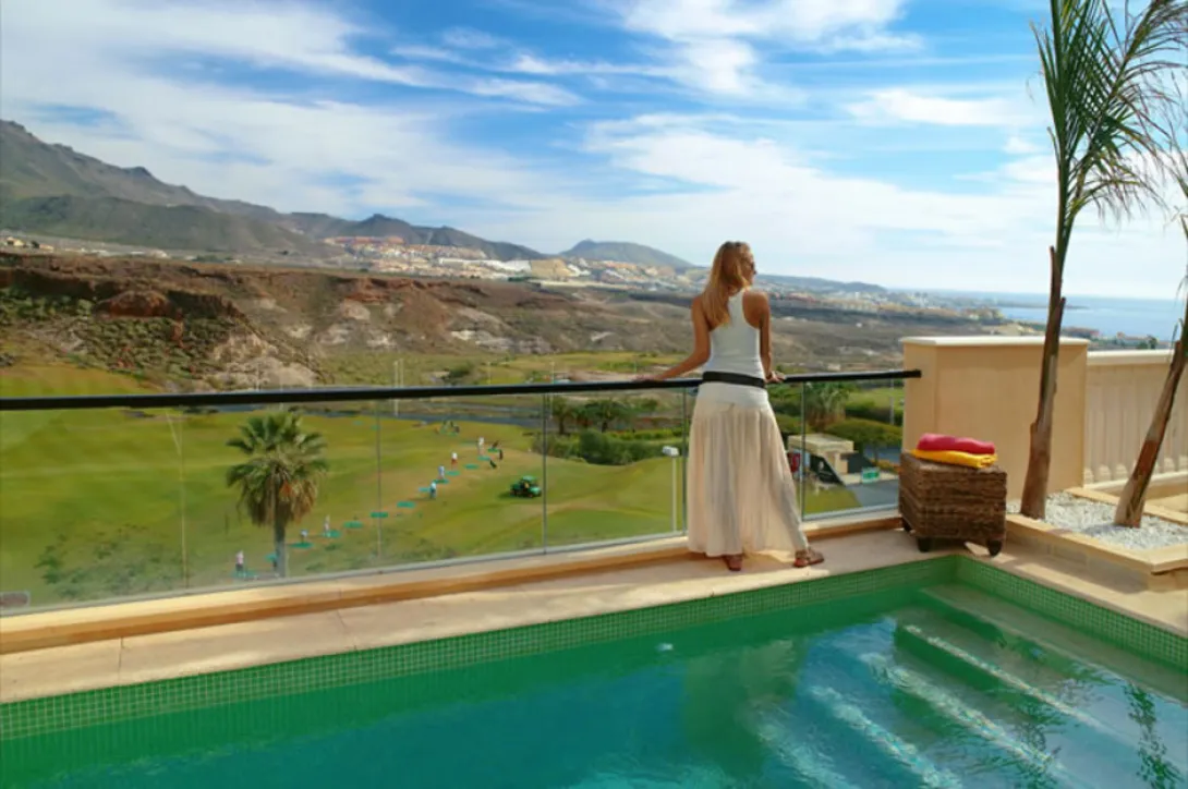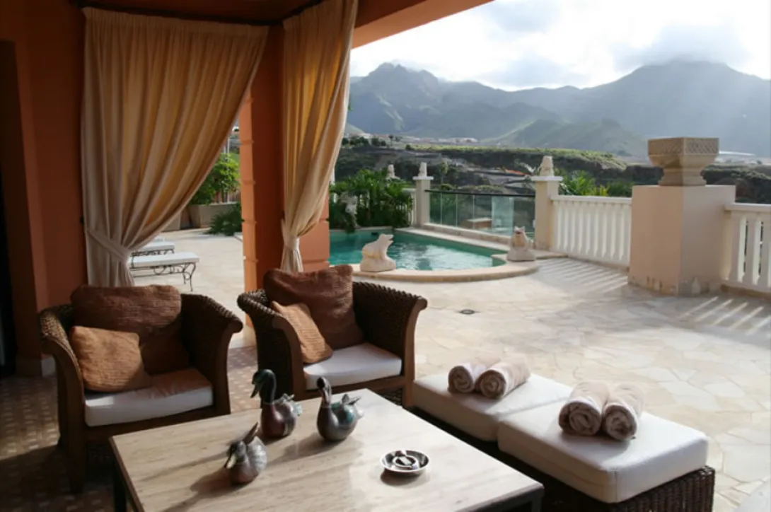 Ali, a vista para a Costa Adeje do alto da falésia não é um luxo, mas uma forma de transformar as 28 villas na sua casa particular, cada uma com a sua própria piscina.é o melhor que se pode ter em termos de conforto e privacidade, comparado às multidões de turistas que tipicamente invadem as Ilhas Canárias.
