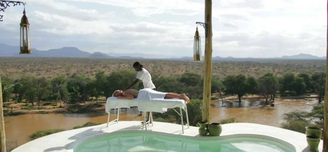 Sasaab está situado num cume rochoso acima das margens do poderoso rio Ewaso Nyiro, no centro-norte do Quénia. Aqui, no coração de Samburu, Sasaab é o único hotel, e a experiência safari é ainda mais espectacular para natureza selvagem do local, numa área conhecida pelas suas variadas espécies.A sua arquictetura segue os fortes princípios de design marroquinos, em que o calor africano é de importância primordial. Cada um dos nove quartos tem uma enorme casa de banho ao ar livre e piscina privada. Da varanda, os hóspedes podem desfrutar das vistas extraordinárias sobre o planalto Laikipia, em direcção ao pico do Monte Quénia. A sua posição sobre o rio facilita a observação das manadas de elefantes que ali vêm para se banhar.Como actividades, o Sasaab oferece caminhadas guiadas, observação de pássaros, observação de estrelas, sem esquecer os safaris, passeios de camelo, a opção de passar uma ou duas noites sob as estrelas ou contactar com as tribos locais Samburu, e um Spa para tratamentos de beleza de classe mundial - refúgio de paz e serenidade, foi construído sobre as rochas com vistas impressionantes e o tranquilo som dos pássaros e do rio abaixo. Os tratamentos usam produtos Liz Earle de cuidados da pele e uma variedade de ingredientes naturais, incluindo café queniano.Sasaab fica próximo das Buffalo Springs National Reserves. é um lugar de grande diversidade natural, com um número surpreendente de animais, do enorme e majestoso elefante ao leão, leopardo, chita e dos "Samburu Five Special": o órix Beisa, a girafa reticulada (da Somália), a zebra de Grevy, o antílope Gerenuk e a avestruz da Somália. E, para além dos vulgares safaris em 4x4, pode explorar toda esta área de camelo, o que oferece uma perspectiva única.Sasaab tem ainda uma piscina principal, construída na encosta, com vista para o rio e o jantar é geralmente servido sob as estrelas. Todos os hóspedes desfrutam de pensão completa durante a sua estadia.