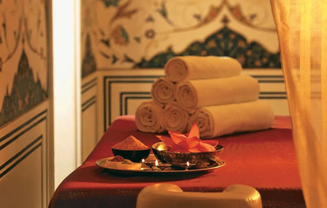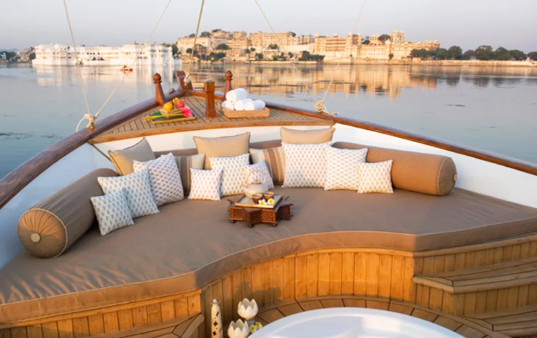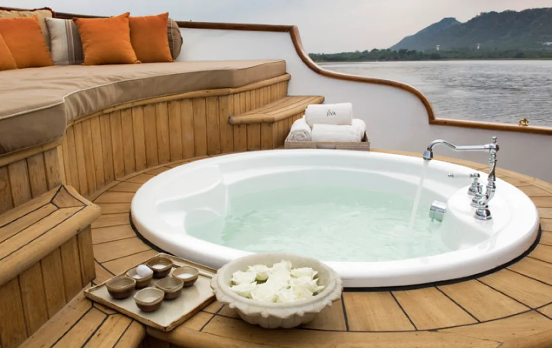 instalado nas águas resplandescentes do lago Pichola, o spa flutuante do Taj Lake Palace de Udaipur é o majestoso Jiva Spa Boat, que combina o esplendor do Taj Lake Palace, as tradições reais e os tratamentos de bem-estar dos jiva Spa.Recreando o ambiente dos cruzeiros do reino de Mewar a bordo destas barcaças cerimoniais, este elegante barco dedicado ao bem-estar, desliza sobre as águas do lago Pichola enquanto terapeutas experimentados prodigalizam os seus tratamentos de grande qualidade à base de produtos naturais.Concebido no espírito dos antigos palácios de Udaipur, o Jiva Spa Boat combina decoração contemporânea e tradição real. A ampla cabina dupla de tratamentos dispõe de ar condicionado, de um espaço de relaxamento, de um banho de vapor e de um duche. A cabina abre-se sobre a proa do barco, que dispõe ainda de um jacuzzi, cama de repouso e espaço para refeições.O Jiva Spa dispõe de um menu de tratamentos preparado para entreter o jiva ou a "Força da Vida" de cada um. Os clientes pode ainda optar por tratamentos especialmente concebidos para diferentes momentos do dia e as naturais diferenças de cada um. Todos os produtos utilizados são naturais e elaborados a partir de ervas, óleos essenciais e ingredientes provenientes do país.
