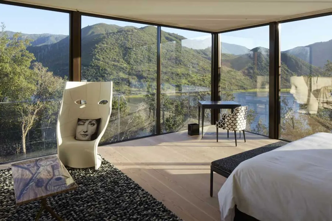 Os quartos – com enormes casas de banho com amenities naturais feitas de extracto de semente de uva – possuem janelas do chão ao tecto e oferecem vistas imaculadas do belíssimo cenário – algumas estão voltadas para as vinhas e o Vale de Colchagua e, outras, abrem-se para os Andes e os seus picos cobertos de neve.