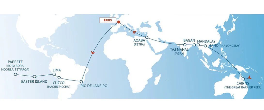Com partida de Paris, percorre o mundo com escala em nove países: Brasil, Peru, Chile, Polinésia Francesa, Austrália, Vietnam, Myanmar, Índia e Jordânia.