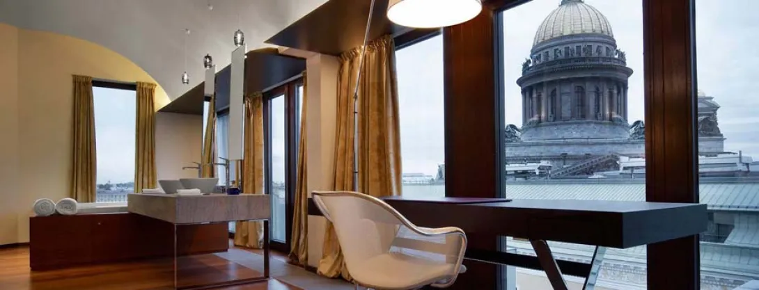 A uma curta distância a pé do palácio de Inverno, a última morada dos czares russos e agora o museu do Hermitage, o W St Petersburg é a base perfeita para explorar a arquitectura da cidade. Primeira incursão da cadeia W na Rússia, é um dos poucos hotéis super-modernos de São Petersburgo e, também, o hippest. Está instalado num edifício do século XIX, mas o interior é definitivamente up to date, com candeeiros disco-ball nos quartos inspirados nos ovos de Fabergé.Tem 137 quartos, 10 dos quais são suites, grande número deles com deslumbrantes vistas sobre a Catedral de Santo Isaac, a maior igreja da cidade, que levou 40 anos a construir.O restaurante de Alain Ducasse produz alta gastronomia com ingredientes locais, agora uma tendência crescente na Rússia. Um cocktail terrace no último andar com, talvez, as melhores vistas sobre cidade está aberta de Maio a Setembro, acompanhando o verão e as suas Noites Brancas.Tem ainda um moderno ginásio e um spa com seis salas de tratamento, nail lounge, sauna e piscina.Parte do apelo do hotel, numa cidade onde o serviço ainda está um pouco "no lado gelado", é o "Whatever / Whenever" mentalidade incutida na equipa sempre entusiasmada e pronta para ajudar os hóspedes. O hotel tam também um serviço de pet com camas e brinquedos.